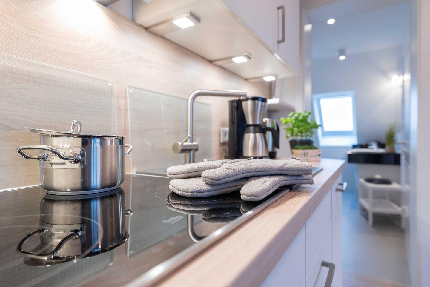 über ein Vier-Feld-Cerankochfeld, einen Backofen, einen Geschirrspüler, einen