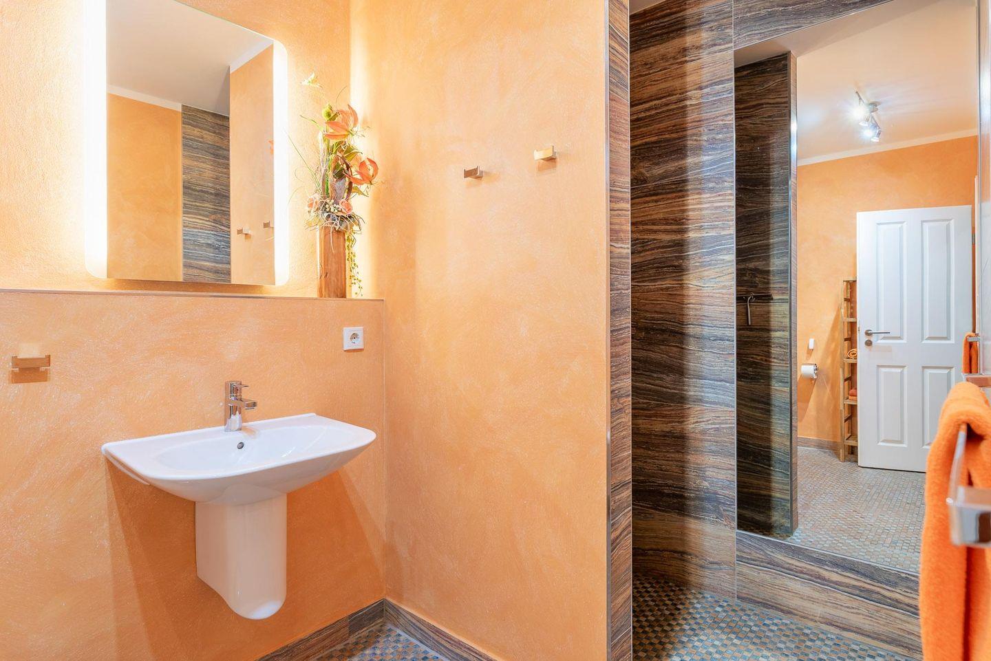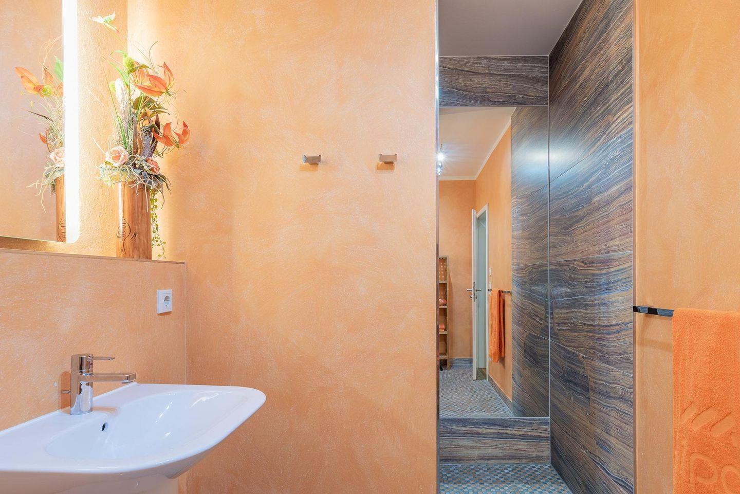Kleiderschrank in warmen Erdtönen. Highlight des Badezimmers ist die geräumige