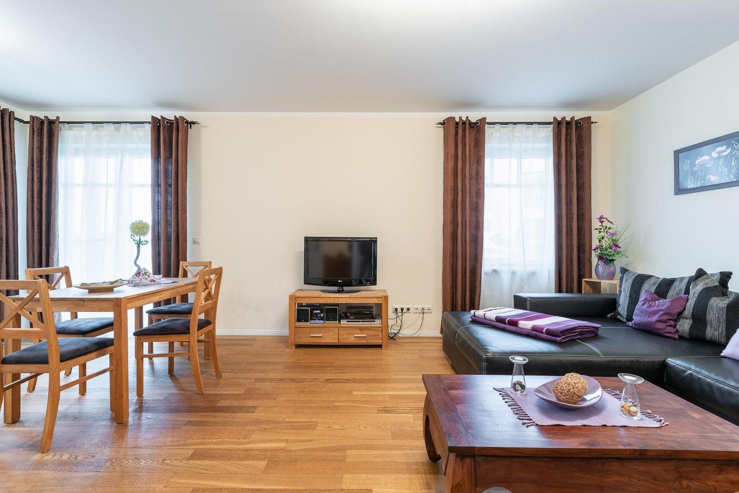 Esstisch mit vier Stühlen, einem Flatscreen-TV inklusive Radio und einem