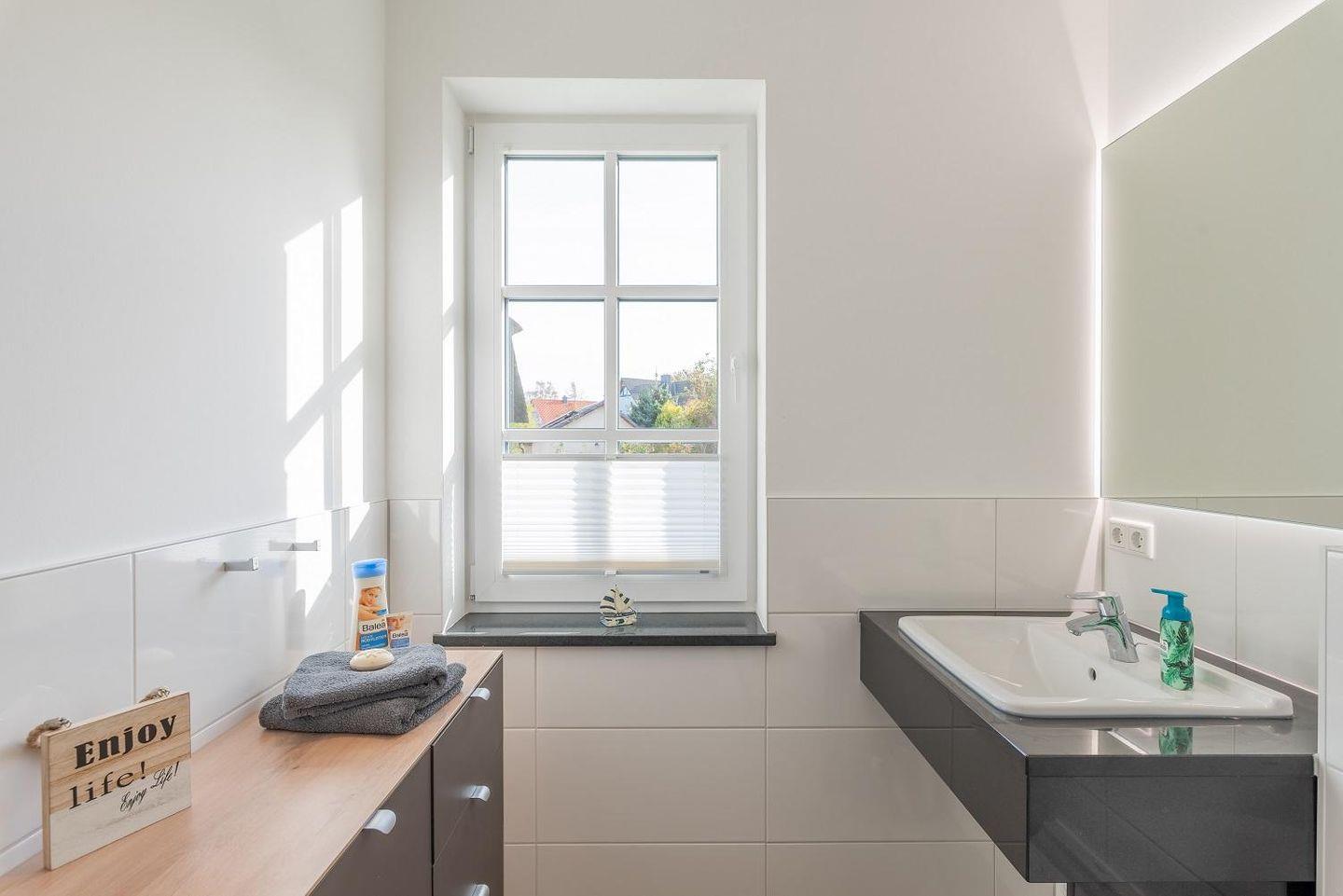 fünfte Person. Das Bad verfügt über eine ebenerdige Dusche, einen Waschtisch mit