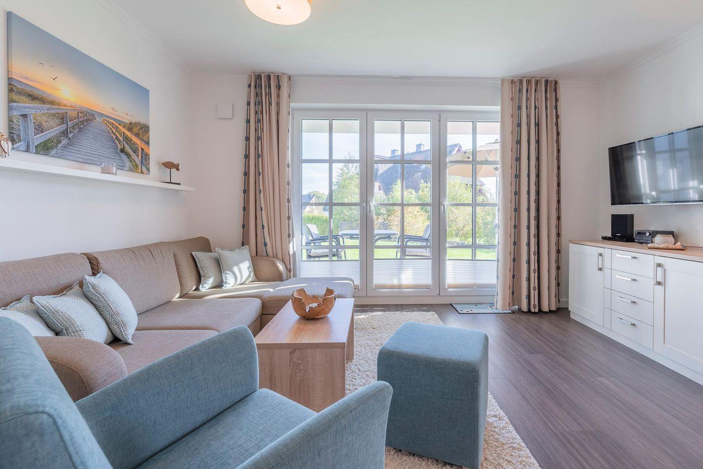 Südseite mit schönem Blick auf modern gedeckten Reetdachhäuser und den
