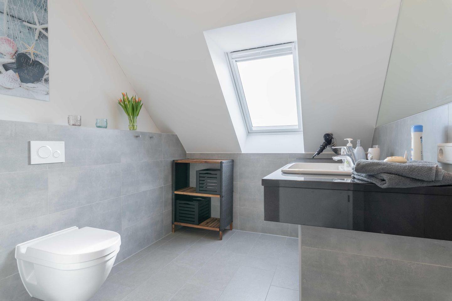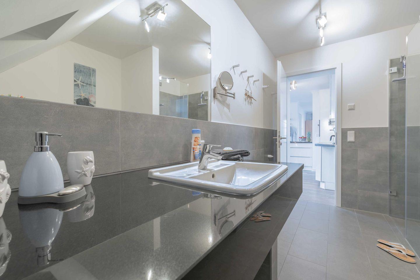 Das elegante Bad ist mit einer bodengleichen Dusche, einem Waschtisch mit großem
