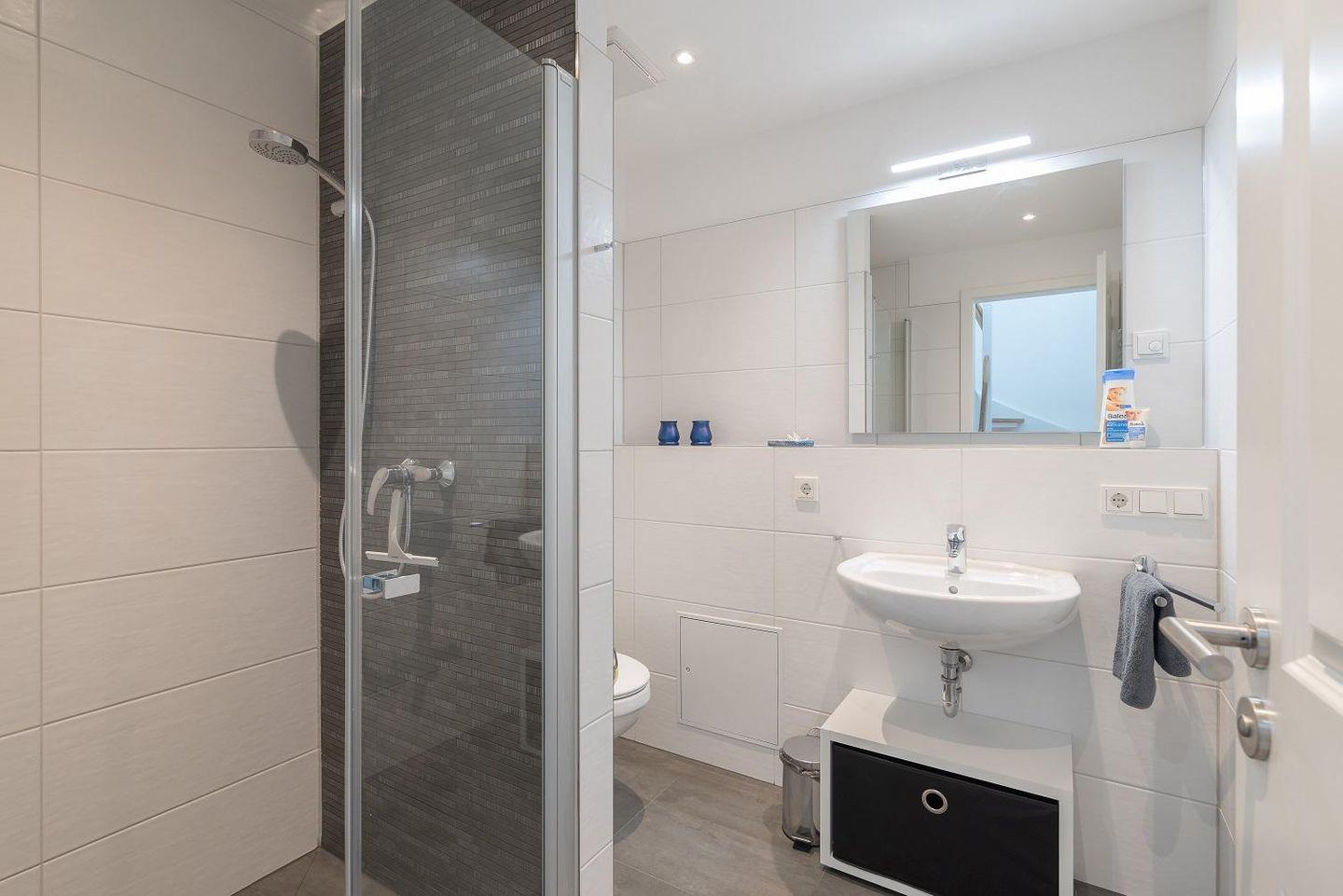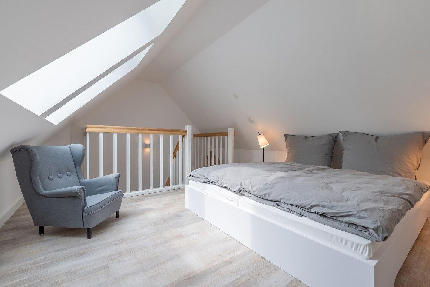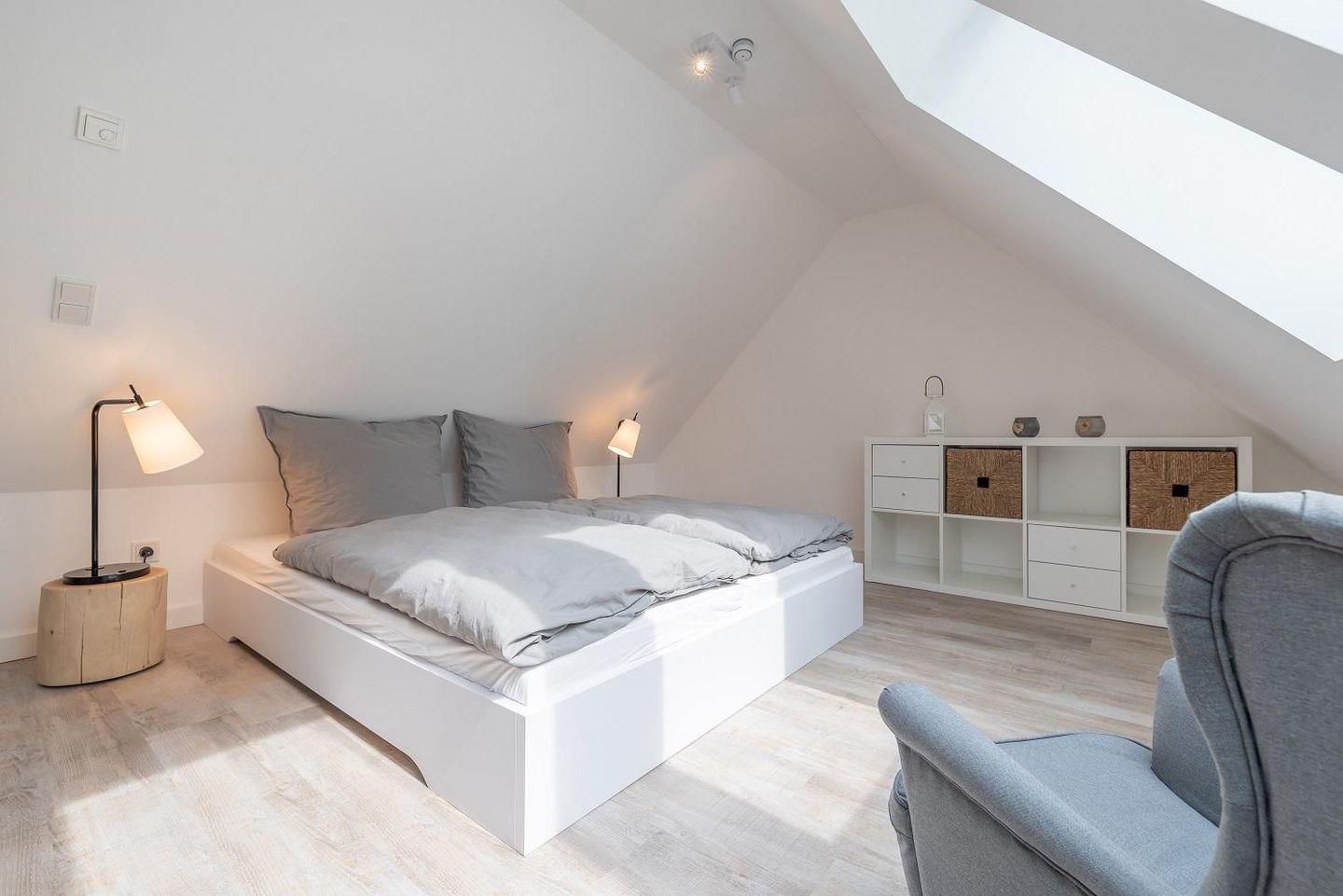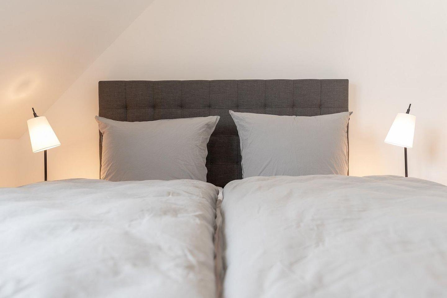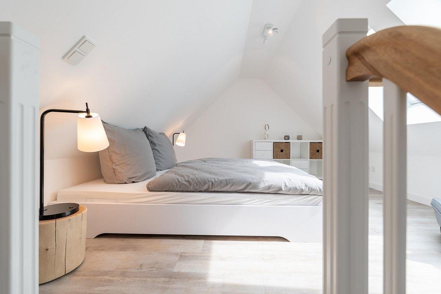 Im ersten Obergeschoss befindet sich ein weiteres großes Tageslichtbad mit Dusche. Zwei Schlafzimmer mit jeweils einem 1,80 x 2,00 m Bett sowie einem Kleiderschrank und einem TV-Gerät laden zum Träumen ein. Im ausgebauten Dachspitzboden befindet sich ein weiteres Doppelbett (1,60 x 2,00 m). Für unsere kleinen Gäste steht ein Kinderreisebett und ein Kinderhochstuhl zur Verfügung.
