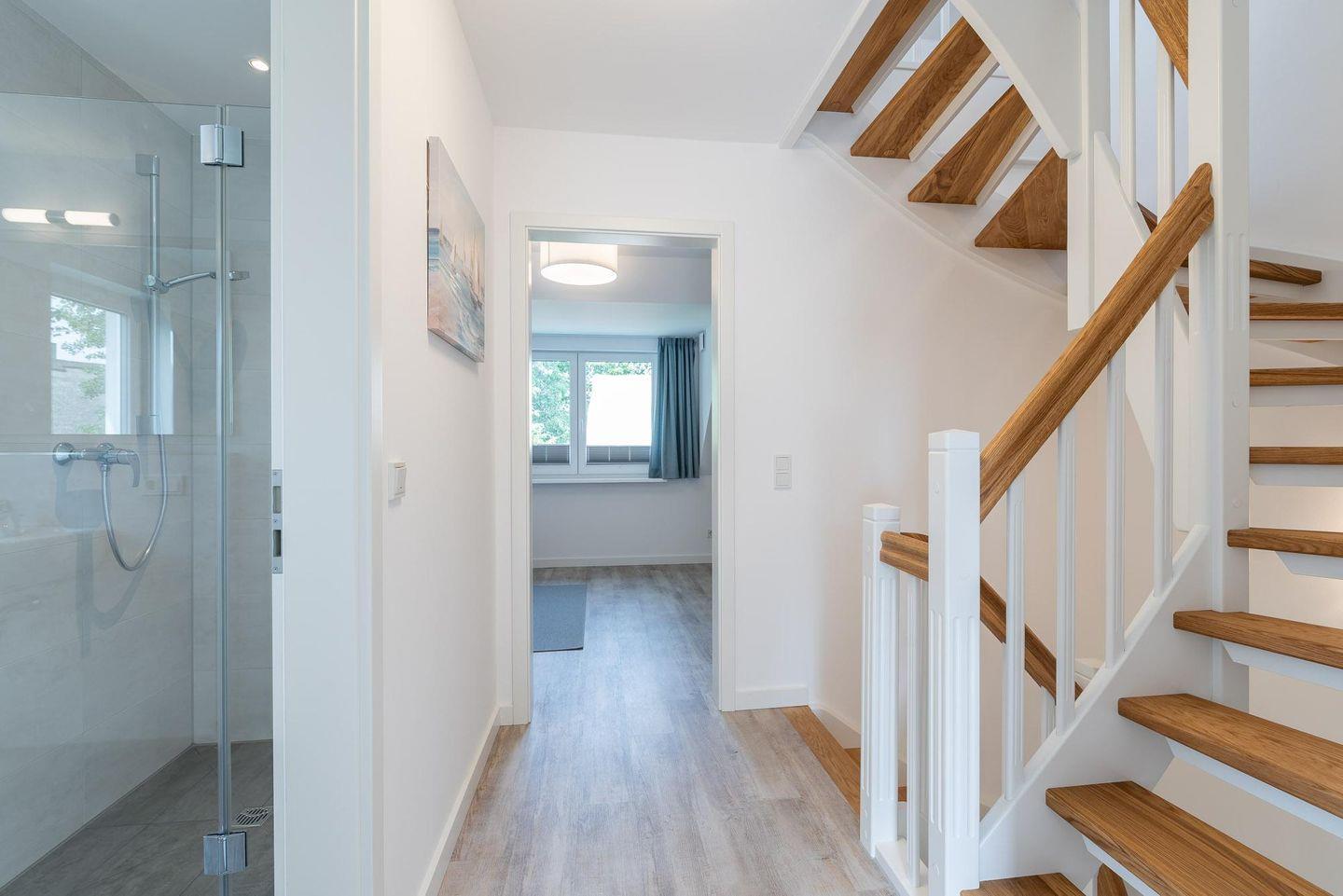 Kleiderschrank und Schuhschrank möbliert. Rechts von der Diele ist ein Gäste-WC