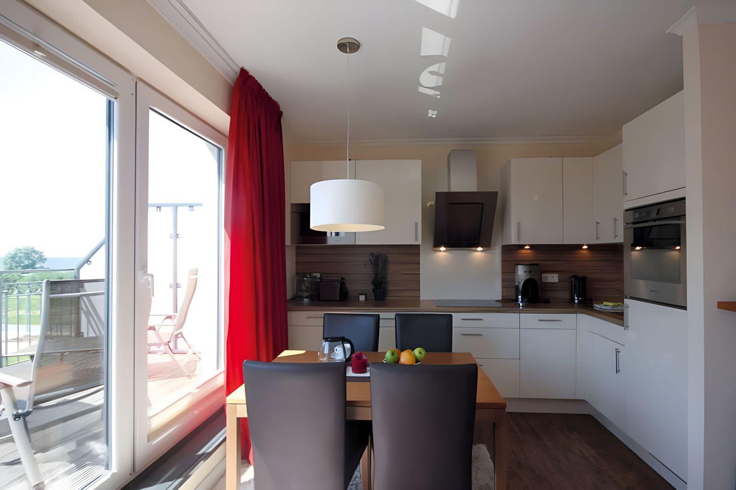 Im WOHN-/ ESSBEREICH empfangen Sie eine gemütliche Schlafcouch (140 x 160 cm), ein Flatscreen-TV mit DVD-Player inklusive zwei DVDs, eine Stereoanlage und ein Esstisch mit vier Stühlen. Für einen geselligen Abend stehen Spiele und Bücher zur Verfügung. Die offene EINBAUKÜCHE ist ausgestattet mit Geschirrspüler, Kühlschrank, inklusive Gefrierfach, Backofen, Cerankochfeld, Kaffeemaschine, Toaster und Mikrowelle.