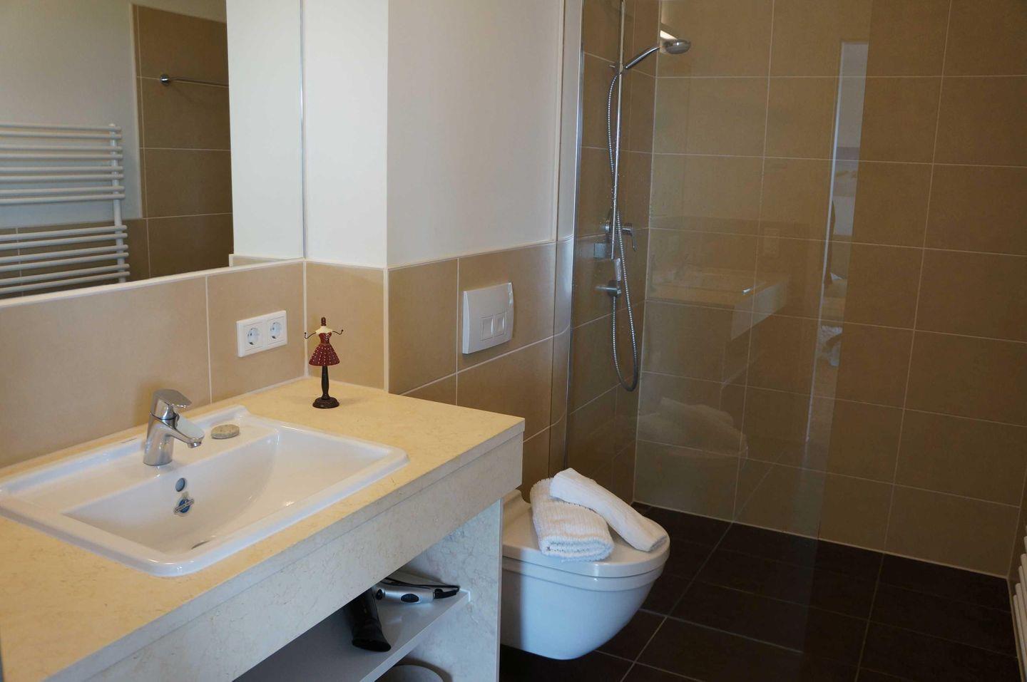Das SCHLAFZIMMER ist ebenfalls mit Massivholzmöbeln aus Ahorn ausgestattet. Es erwarten Sie ein gemütliches Doppelbett (Liegefläche 180 x 200 cm/ getrennte Matratzen/ integrierter Bettkasten) und ein dreitüriger Kleiderschrank mit großem Innentürspiegel sowie ein „Herrendiener“. Das elegante DUSCHBAD besticht mit bodengleicher Dusche, Föhn und Handtuchtrockner. Ein separater ABSTELLRAUM mit Schuhregal bietet Stauraum für Ihr Gepäck. Highlight der Wohnung ist die weite DACHTERRASSE (Balkon) in Ost-Süd-Lage, die aus jedem Zimmer heraus begehbar ist. Die vorhandene Sitzecke lockt zum Frühstücken bei Sonnenaufgang und ein STRANDKORB mit Fleece Decken sorgt für gemütliche Stimmung auch in den kühleren Abendstunden. Ein Sonnenschirm steht ebenfalls zur Verfügung. Eine Fußbodenheizung sorgt bei Bedarf für wohlige Wärme in allen Räumen.
