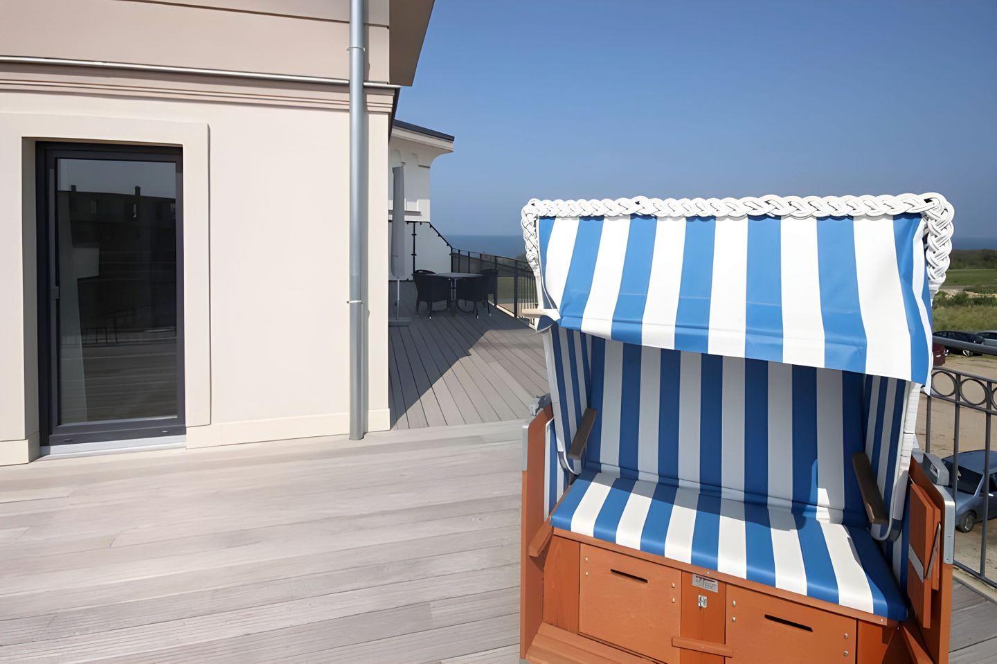 STRANDNAHE EXKLUSIVE 2-RAUMWOHNUNG FÜR MAX. 3 ERWACHSENE UND 1 KLEINKIND, DACHTERRASSE (BALKON) MIT STRANDKORB UND SEITLICHEM MEERBLICK IM 2. OG.