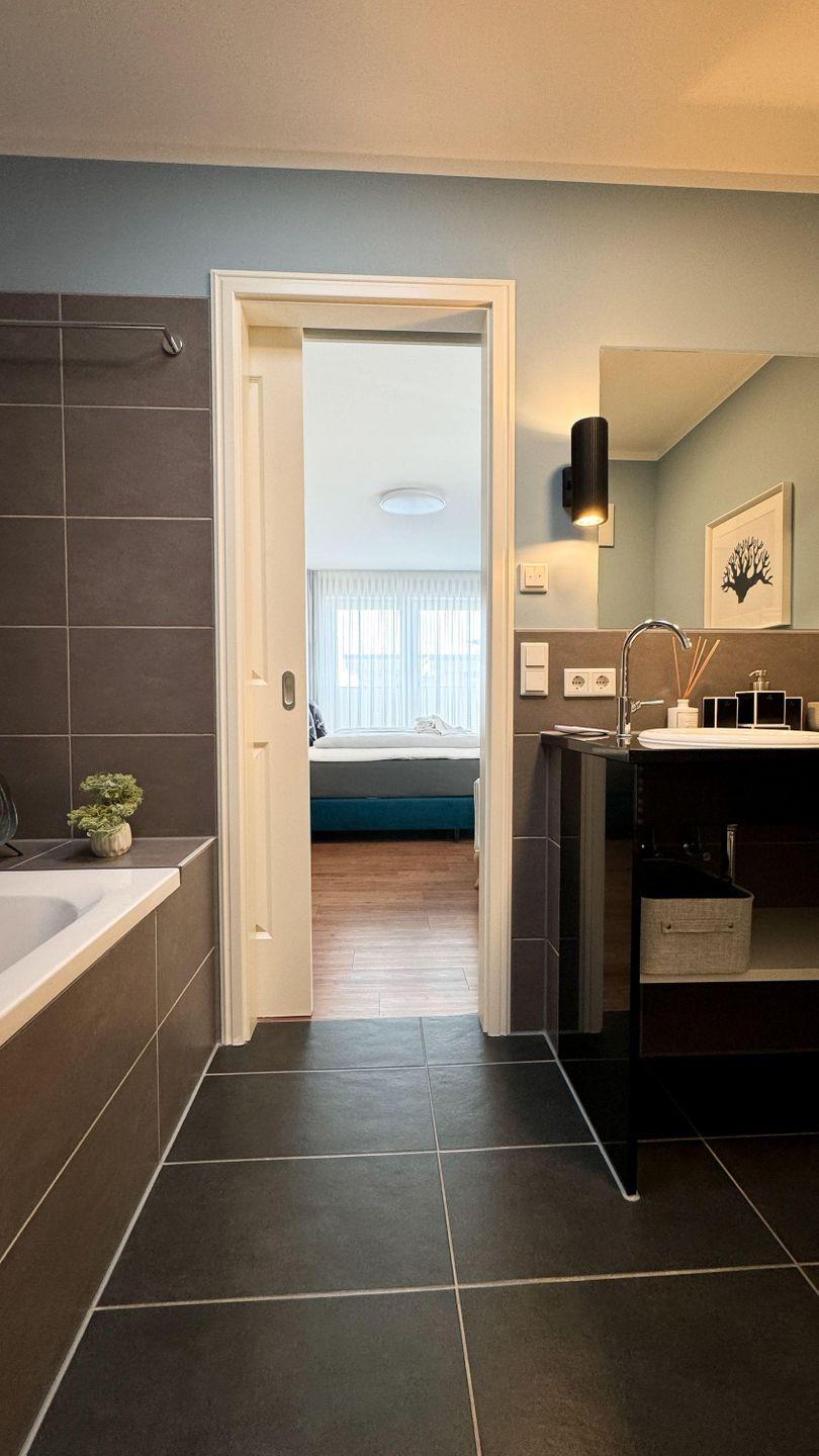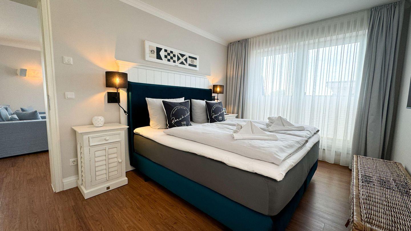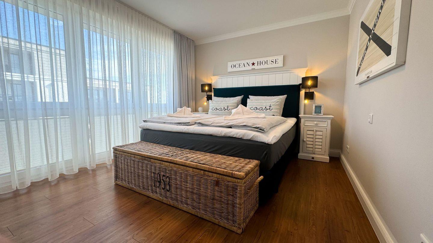 Die SCHLAFZIMMER verfügen über gemütliche Doppelbetten (180 x 200 cm /durchgehende Matratze) und geräumige Kleiderschränke. Ein separater ABSTELLRAUM bietet Stauraum für Ihre Urlaubskleidung. In einem der Schlafzimmer erwartet Sie zudem ein weiterer Flatscreen-TV. Die Ferienwohnung besticht mit einem WANNENBAD und einem DUSCHBAD mit bodengleicher Dusche. Ein Föhn und Handtuchtrockner ergänzen die Badausstattung. Auf der herrlichen DACHTERRASSE (Balkon) in Süd-Westausrichtung erwarten Sie ein traumhafter seitlicher Meerblick, ein Tisch sowie Stühle für gemeinsame Mahlzeiten an der frischen Luft. Eine SITZLOUNGE mit zwei Loungesesseln steht ebenfalls bereit. Nur 50 Meter vom Strand lässt es sich dort beim Geräusch der Wellen bestens entspannen. Eine Fußbodenheizung in allen Räumen sorgt für angenehme Wärme. Auch in den kalten Jahreszeiten.