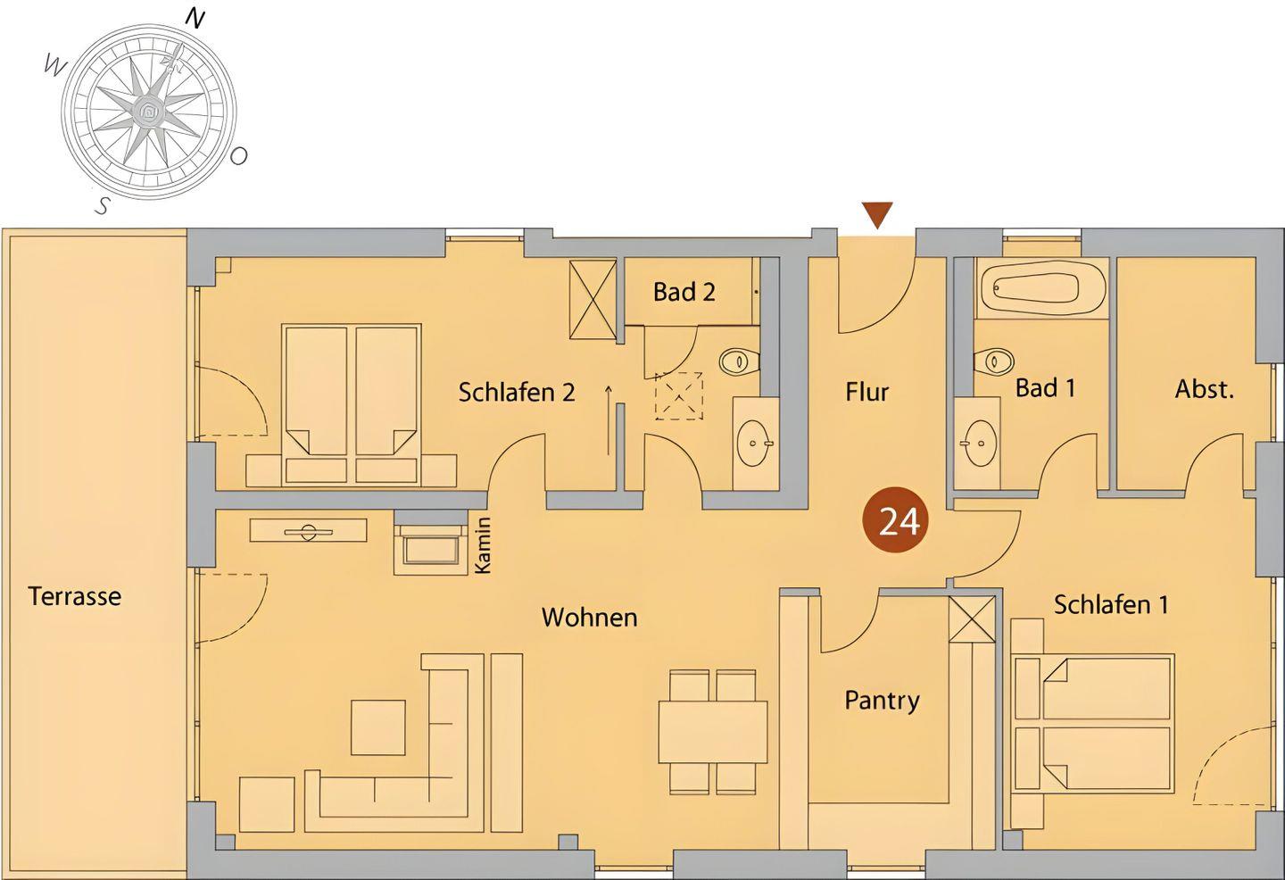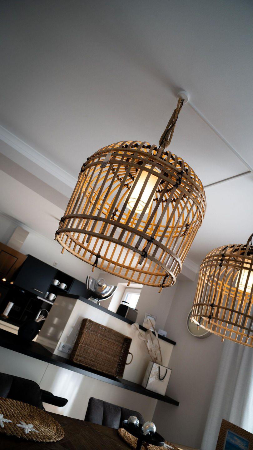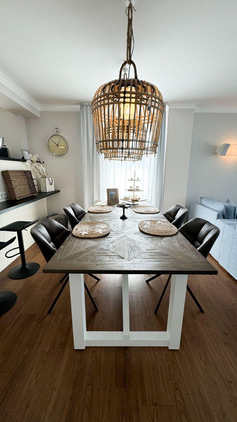 Die Villa Bernstein liegt in bester Lage und ist nur durch einen Radweg vom Strand getrennt. Die Wohnung wurde 2024 liebevoll mit hochwertigen Möbeln von "Riviera Maison" neu eingerichtet. Das WOHN/ ESSZIMMER empfängt Sie mit einer bequemen Sitzecke, einem Flatscreen-TV mit DVD-Player, einer Stereoanlage und einem drehbarem HOLZ- KAMINOFEN (Kaminholz muss selbst gestellt werden.) Die offene EINBAUKÜCHE ist ausgestattet mit Geschirrspüler, Kühlschrank, inklusive Gefrierfach, Kaffeemaschine, Wasserkocher und Toaster. Ein großzügiger Esstisch mit Armlehnstühlen lädt zum Verweilen auch nach den Mahlzeiten ein.