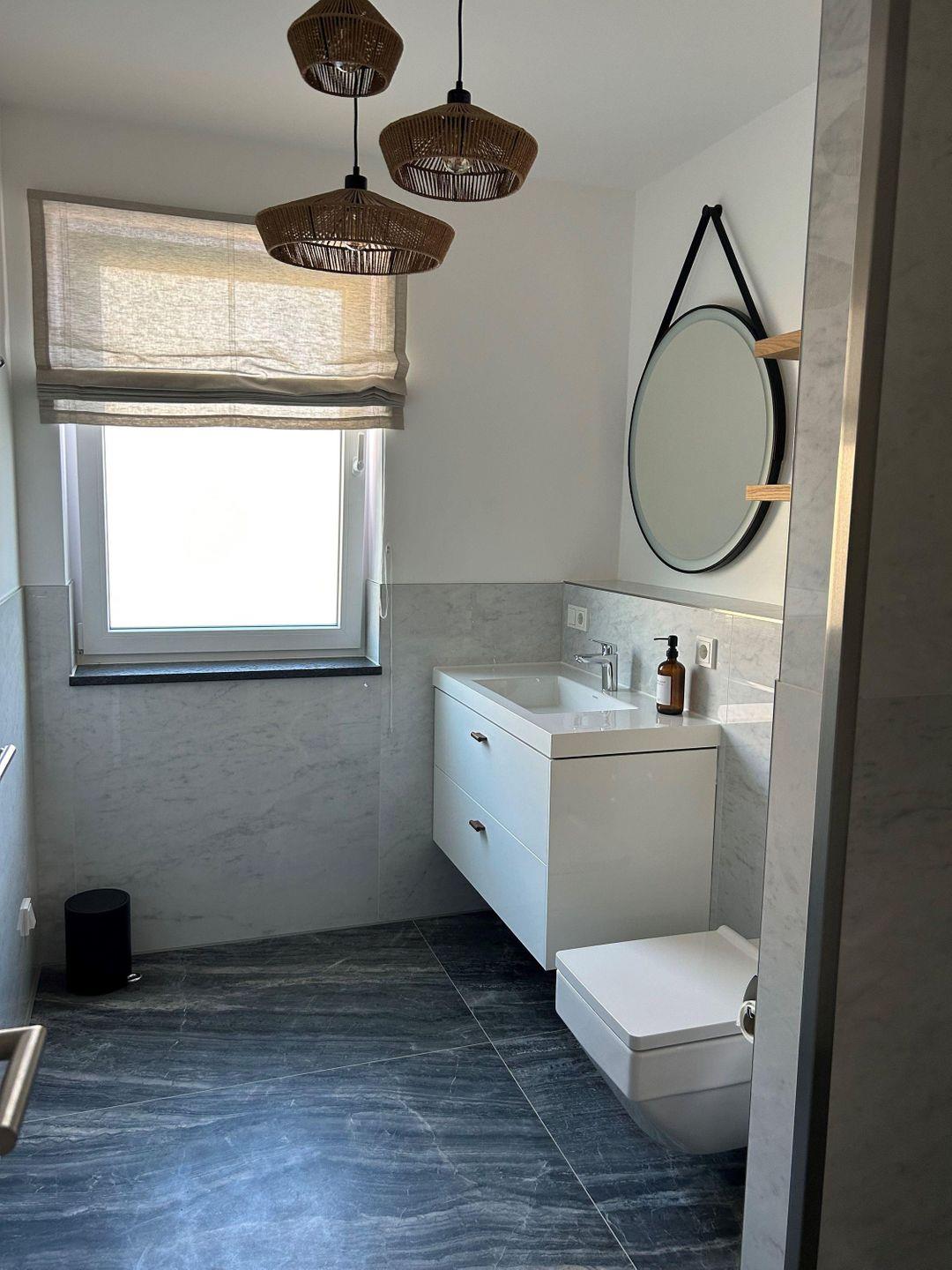 Das helle Badezimmer mit Fenster ist ausgestattet mit einer bodengleichen