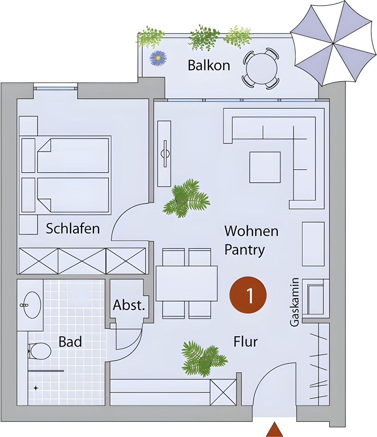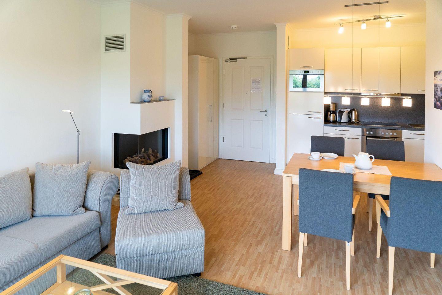 Die mit hochwertigen Möbeln ausgestatte ZWEI-ZIMMER-WOHNUNG ist für zwei Erwachsene und ein Kind bestens geeignet. Das SCHLAFZIMMER empfängt Sie mit einem gemütlichen Doppelbett (160 x 200m) und einem Schrank mit viel Stauraum. Im kombinierten ESS- UND WOHNRAUM befinden sich eine bequeme Couch mit Schlaffunktion (140 x 190 m) und ein großer Holztisch mit vier Stühlen. Für die Unterhaltung sorgen sowohl ein TV- Gerät als auch ein Bluetooth-Lautsprecher. An kalten Tagen sorg eine Gas-Kamin für zusätzliches Wohlbefinden.