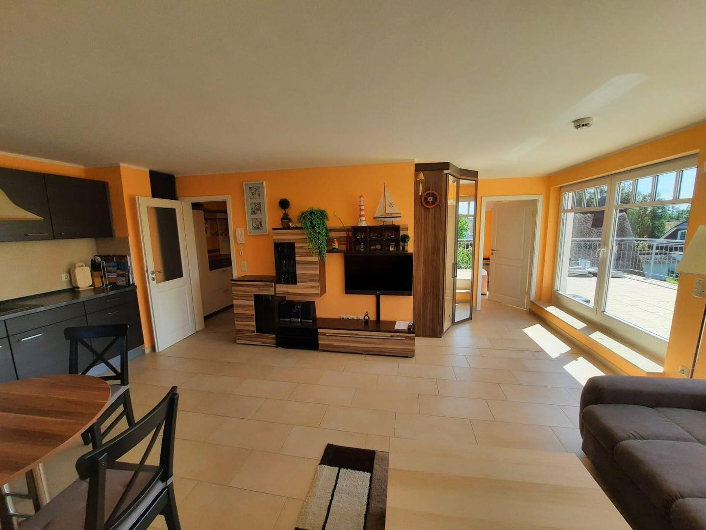 Die Wohnung wurde liebevoll im gemütlichen Wohnbereich mit einer großen Sitzlandschaft und Flachbildfernseher ausgestattet. In der offene Küche mit integrierten Essbereich eingerichtet mit Geschirrspüler, Mikrowelle, Kaffeemaschine, Toaster und Wasserkocher und läßt somit keine Wünsche offen. Das Schlafzimmer mit komfortablen Doppelbett und das Duschbad komplettieren die schöne Ferienwohnung. Das Bad besticht mit einem Wachtisch samt großen Spiegel und einer Dusche. ein großzügiger Balkon in Süd-Ausrichtung lädt zum Sonnenbaden ein.