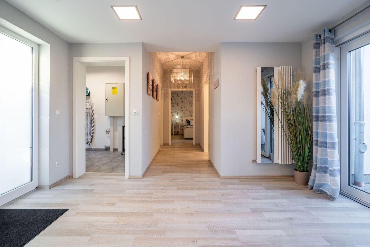 Durch den großzügigen Flur mit bodentiefen Fenstern und Zugang zur ersten