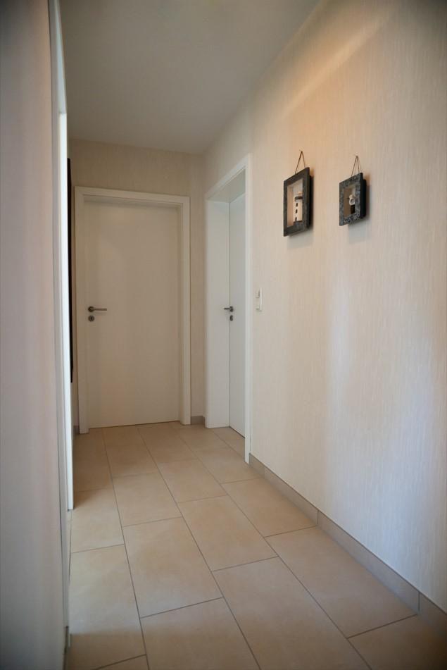 mit Laminat versehen, während der Rest der Wohnung gefliest ist. Ein modernes