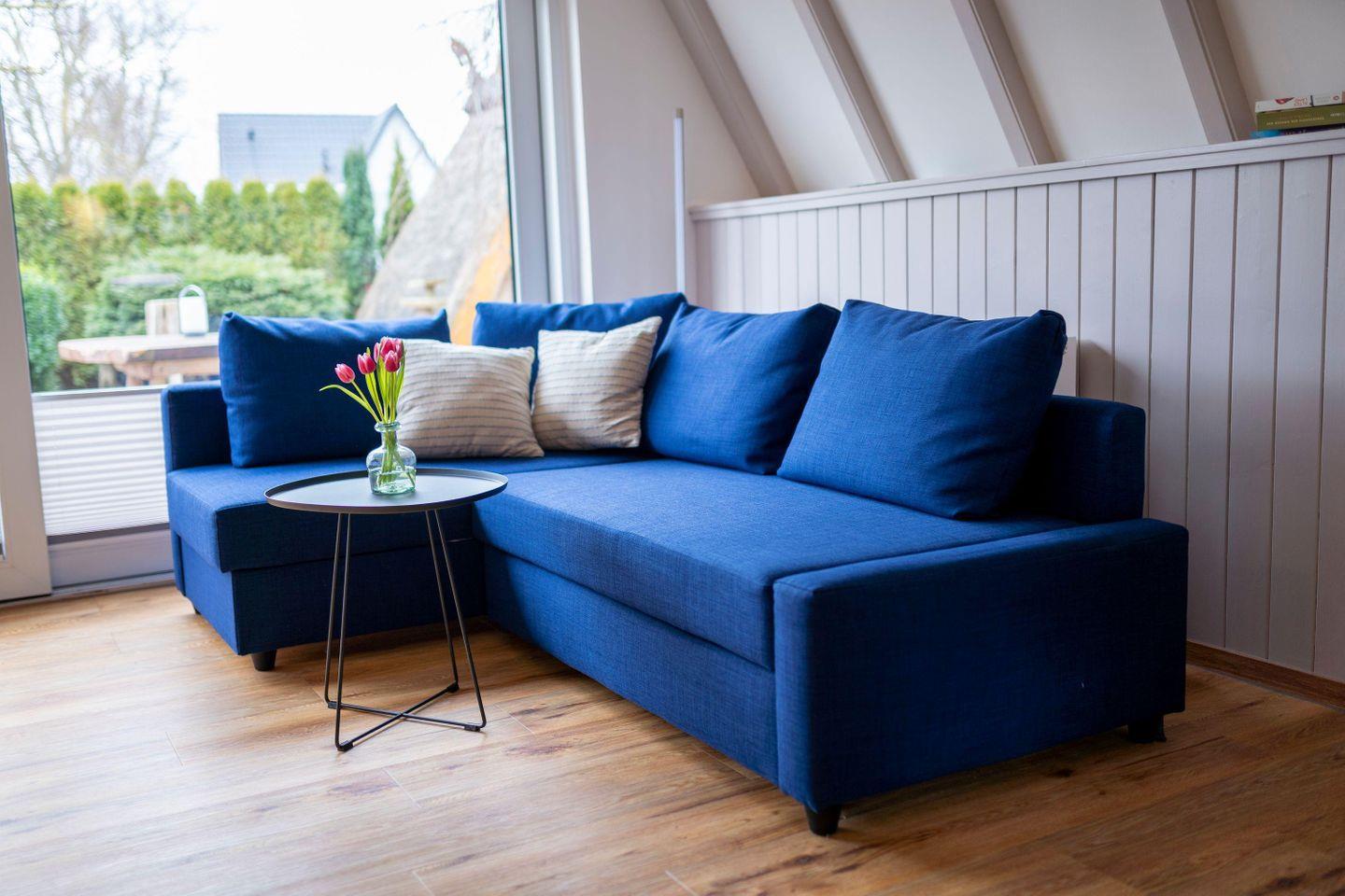 blauen Ecksofa mit Blick in den Garten und genießen Sie den Tag. Der
