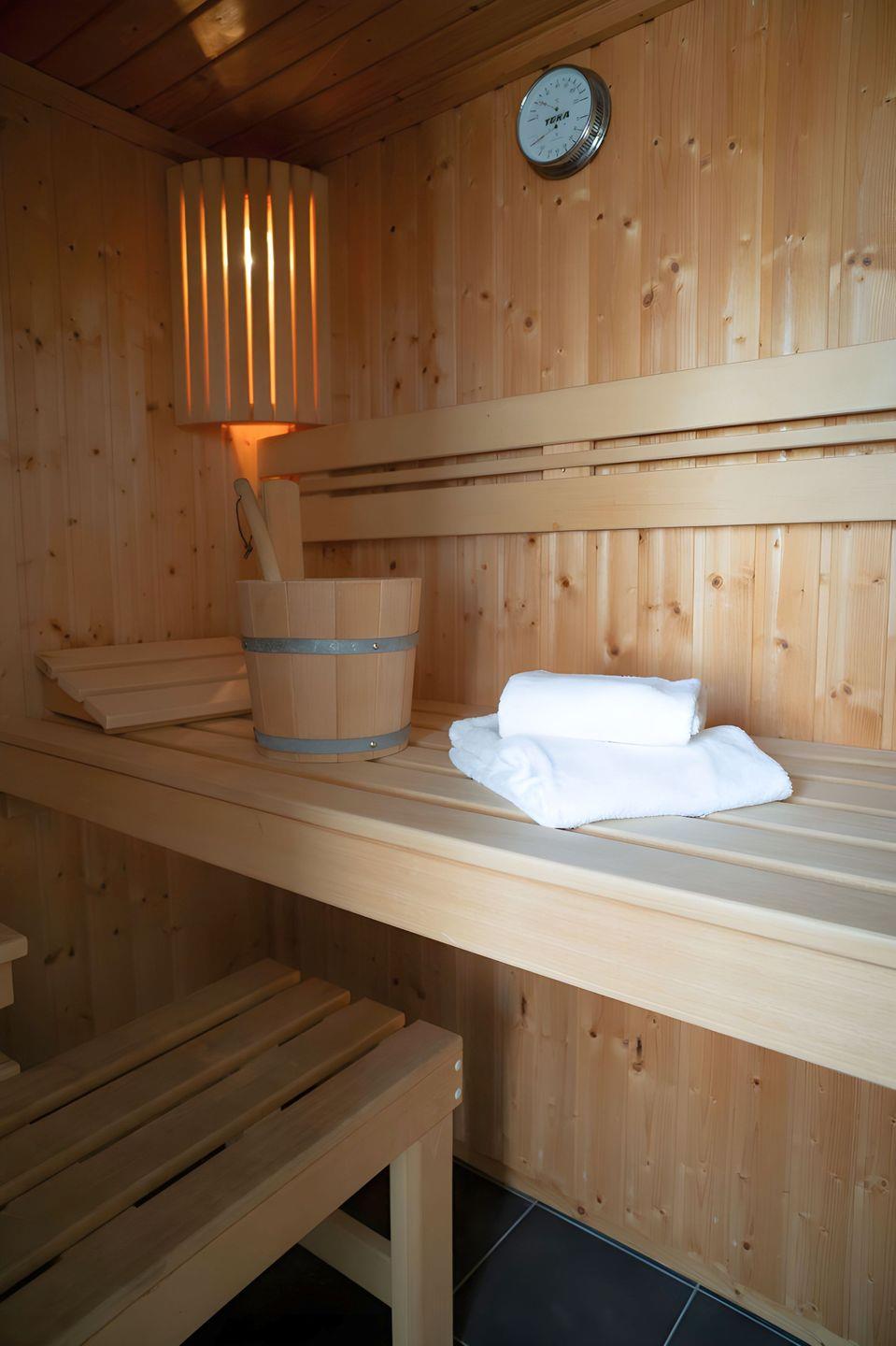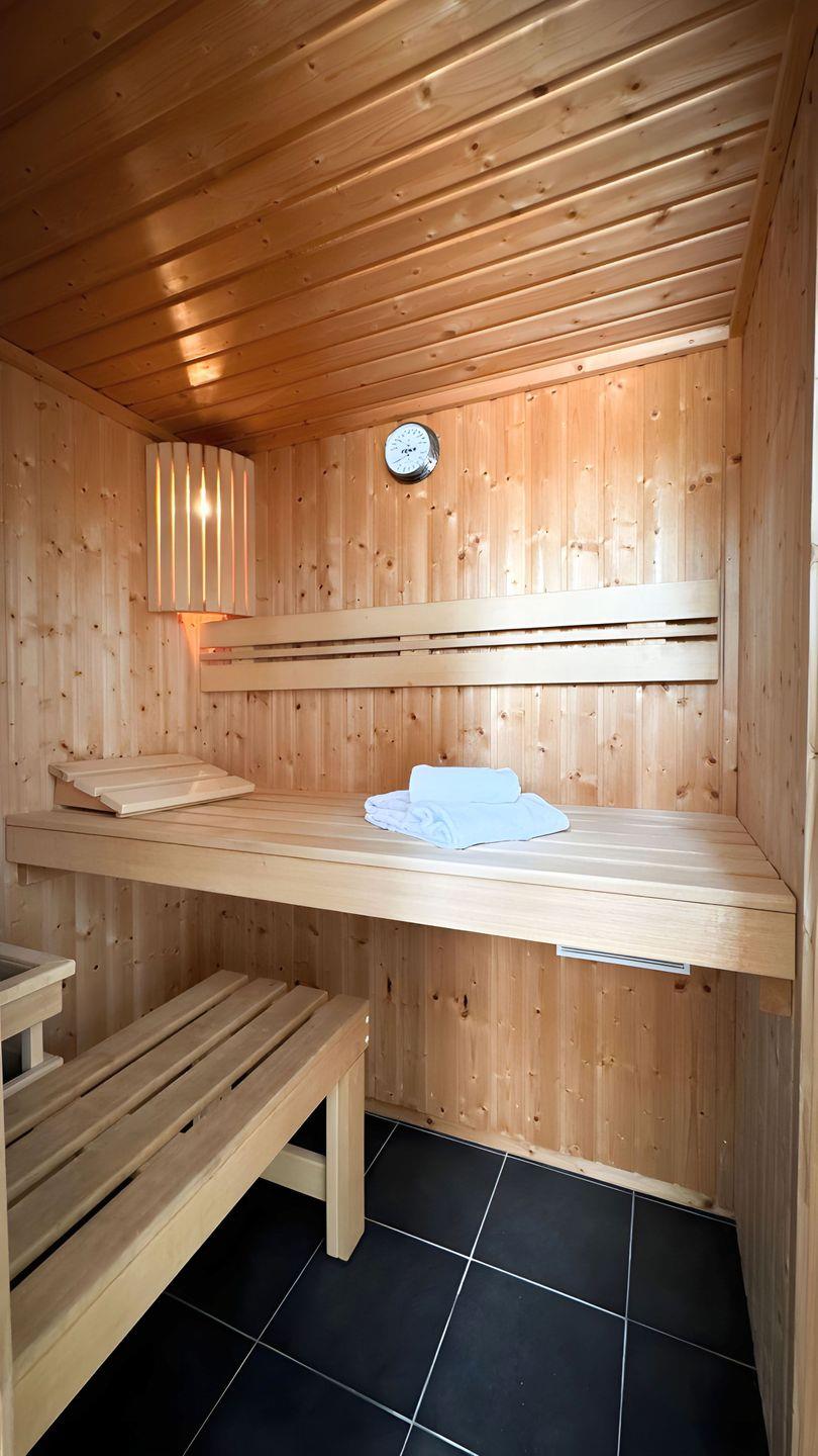das weitläufige Bad mit Badewanne, Dusche und eigener Sauna.