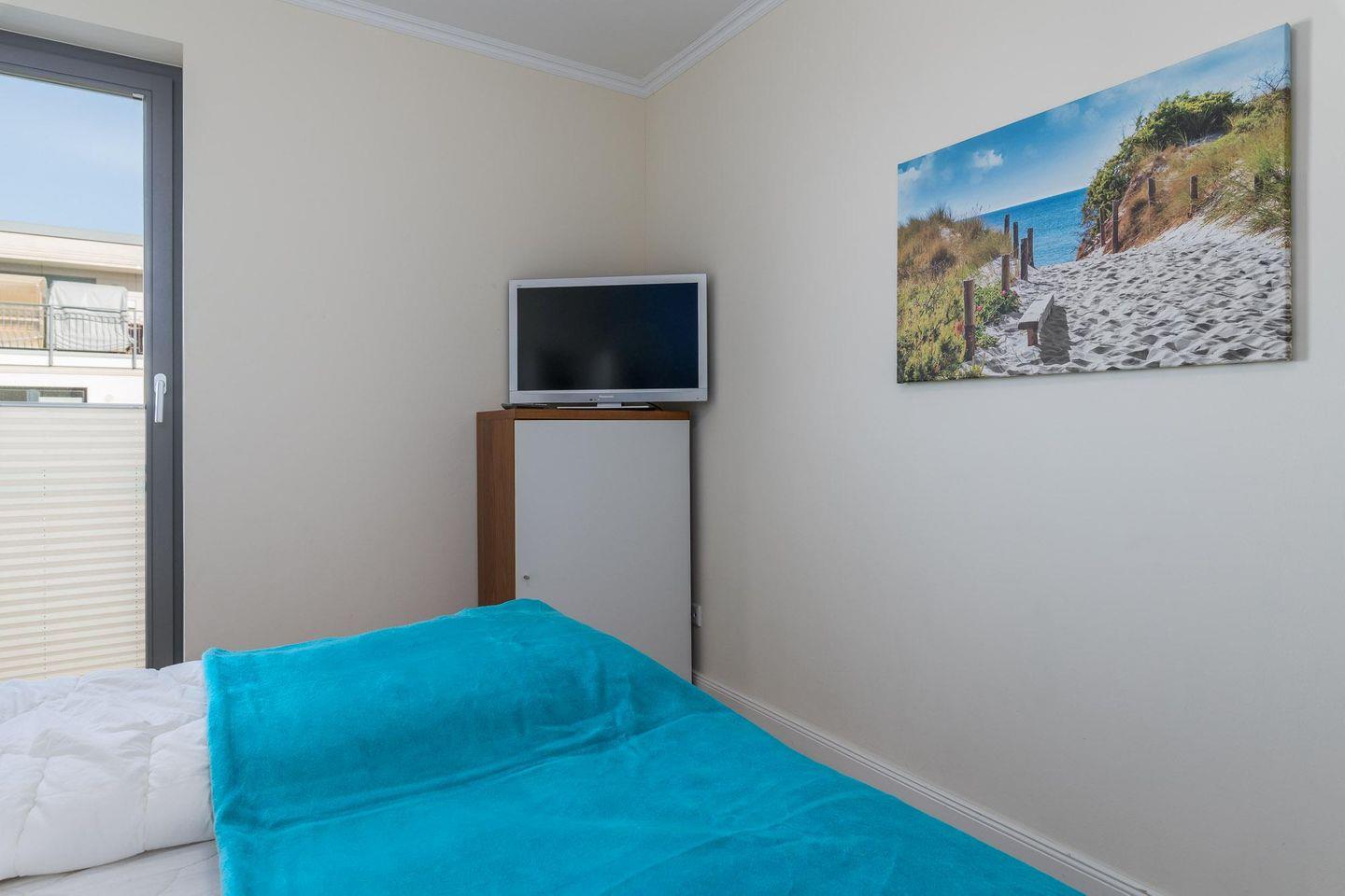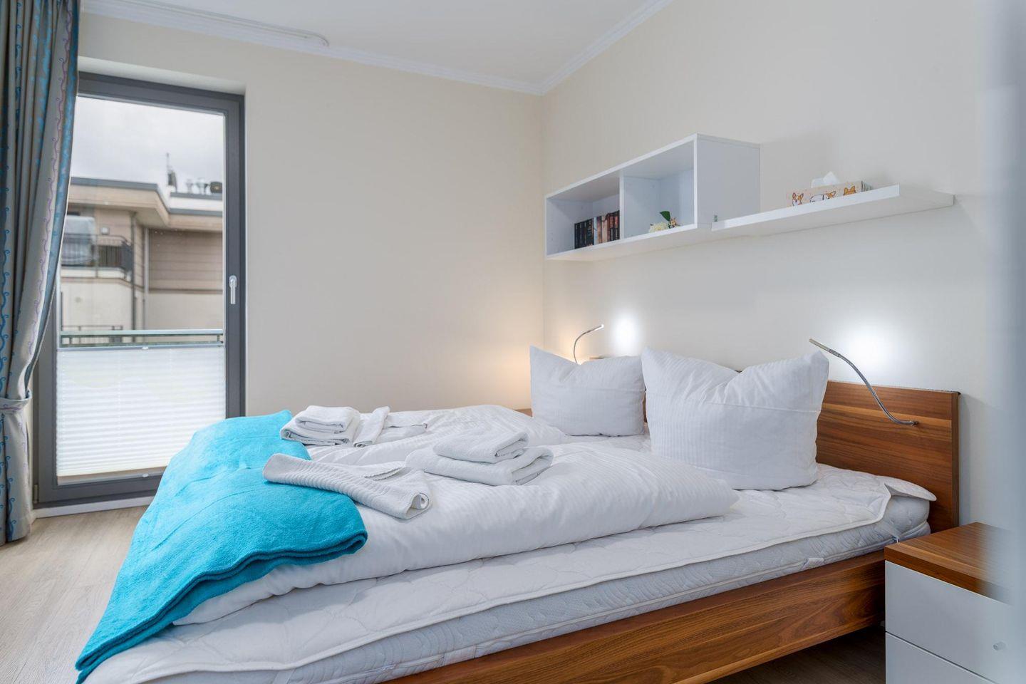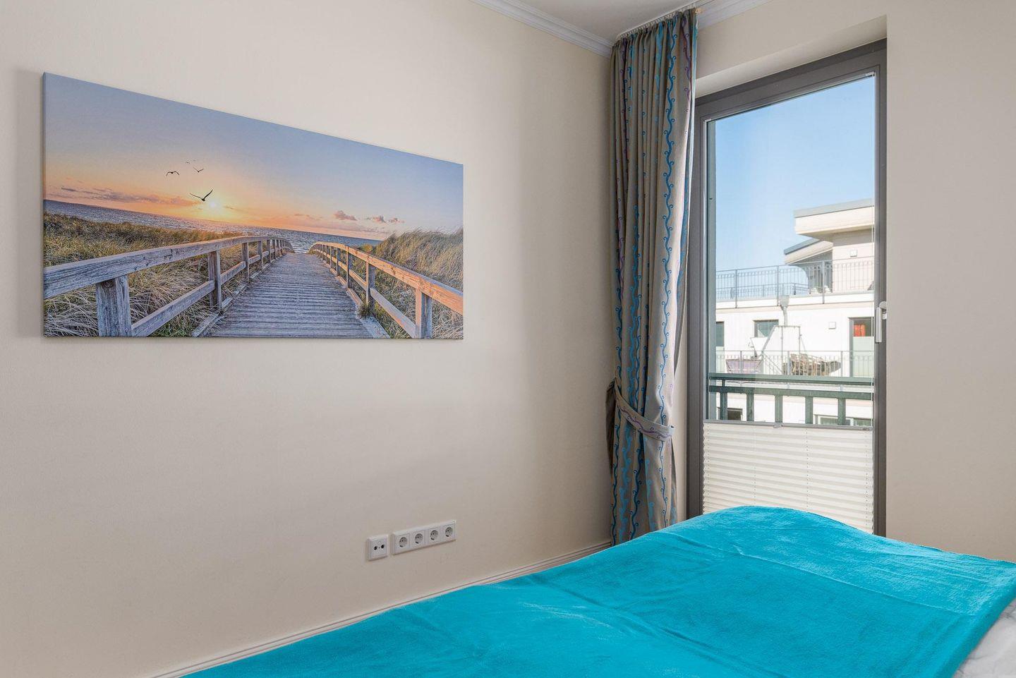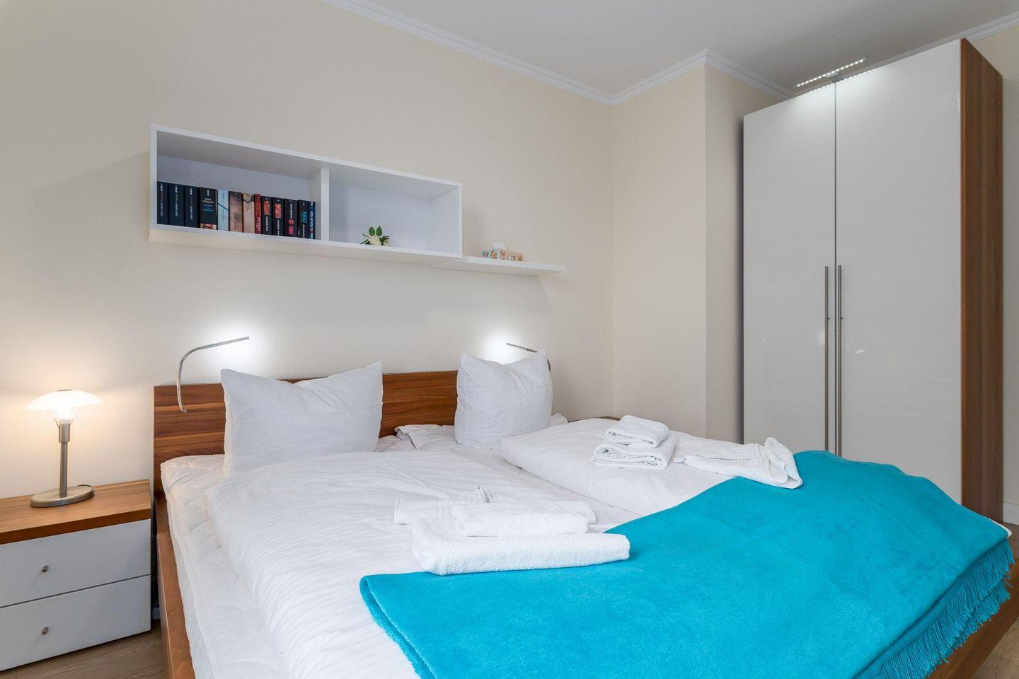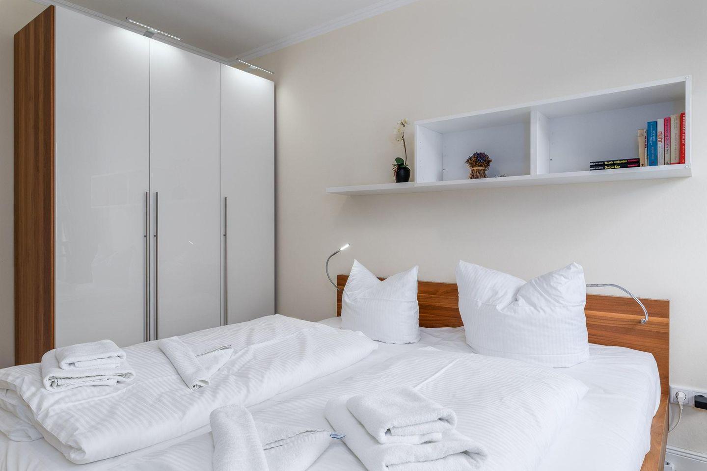 In den beiden wunderschönen SCHLAFZIMMERN sorgen je ein Doppelbett (hochwertige Kaltschaum-Matratzen auf Lattenrost) für den erholsamen Urlaubsschlaf. Für den nötigen Stauraum Ihrer Urlaubskleidung sind mehrere raumhohe Kleiderschränke eingebaut worden. Zusätzlich steht ein separater Abstellraum in der Wohnung bereit. Eines der Schlafzimmer verfügt zudem über ein weiteres TV-Gerät. Das elegante DUSCHBAD besticht mit einer ebenerdigen Dusche, inklusive Glasabtrennung und Handtuchtrockner. Angrenzend befinden sich ein weiteres GÄSTE-WC. Zu einem sonnigen Frühstück lockt der charmante ECKBALKON mit Meerblick in Nord-Ost-Ausrichtung. Eine Fußbodenheizung in allen Räumen ist für angenehme Wärme zuständig.