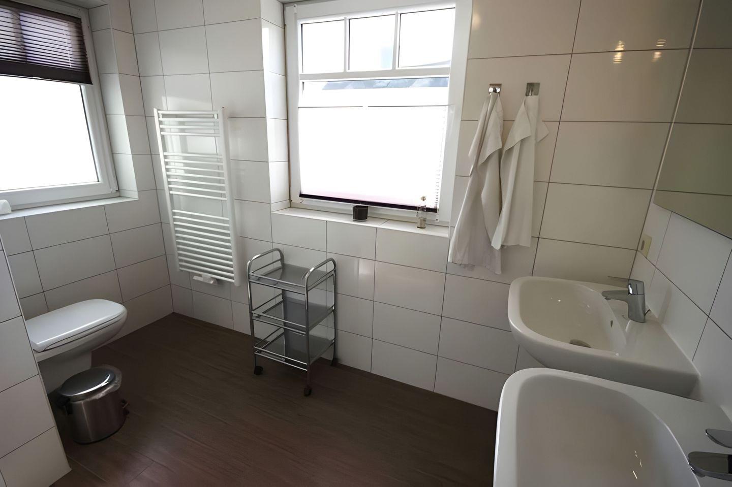 mit ebenerdiger Dusche, zwei Waschbecken und Fön. Eine Fußbodenheizung sorgt in