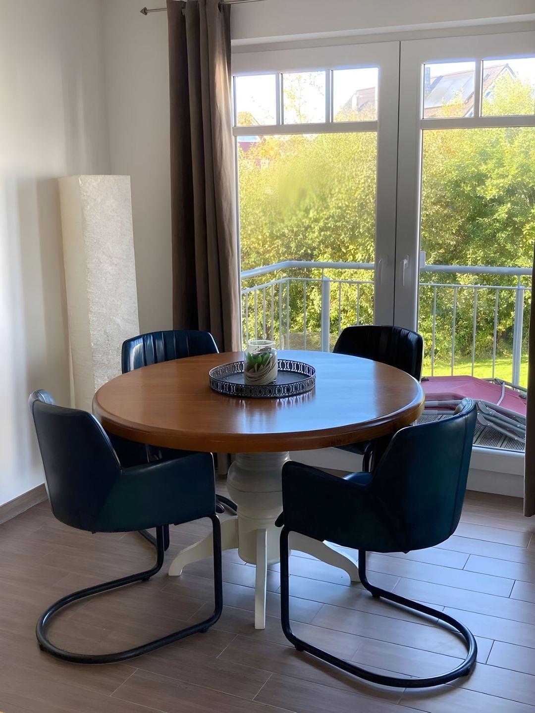 großer moderner Esstresen mit zwei Stühlen und ein weiterer Esstisch mit vier