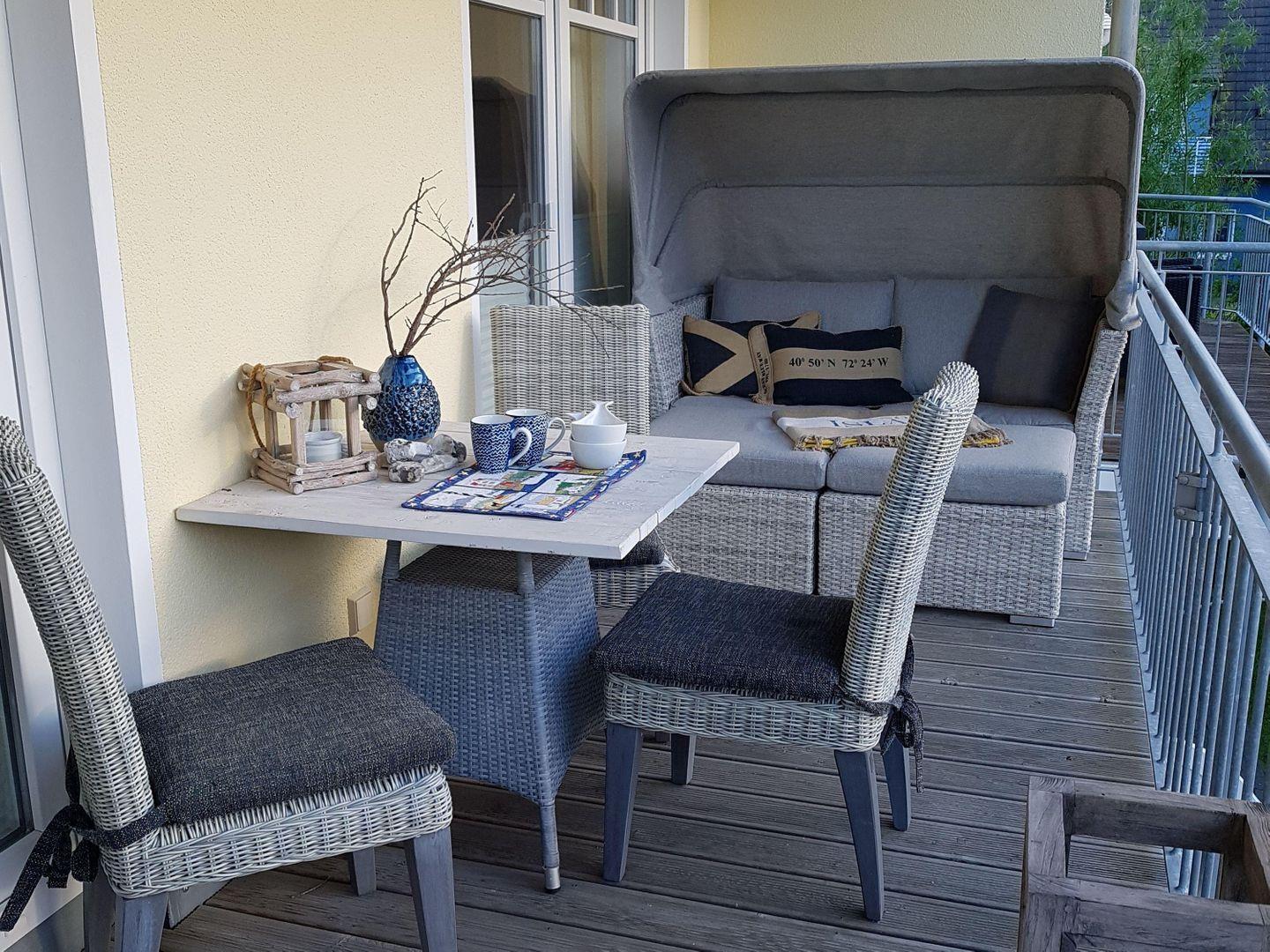 Tisch und Stühlen erwartet Sie zudem ein stilechter Strandkorb.