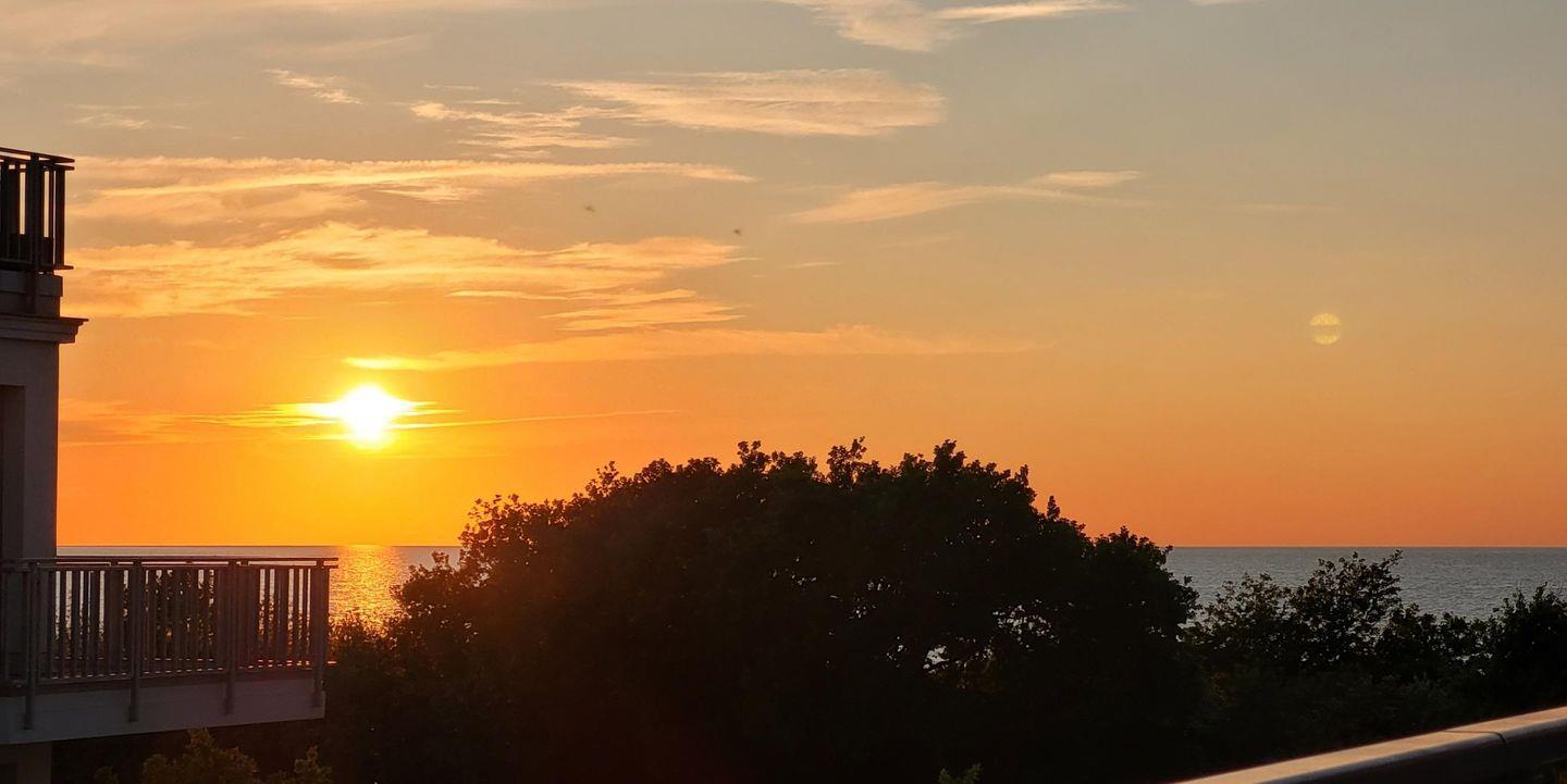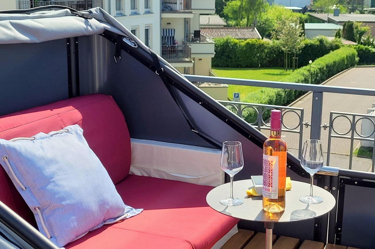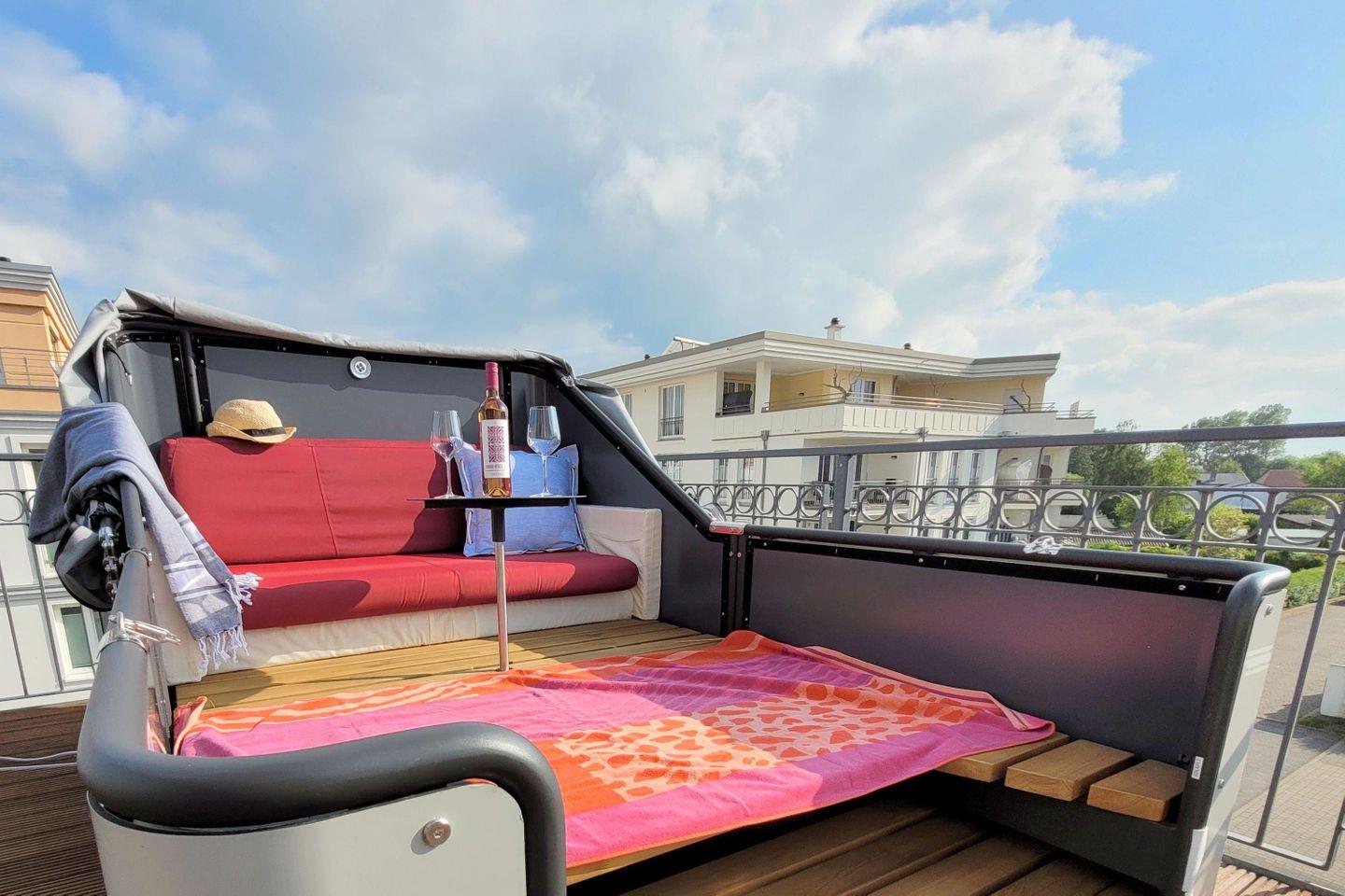 Das einzigartige Penthouse-Highlight ist die 70 qm große DACHTERRASSE (Balkon) in Süd-West-Lage. Dort verwöhnt Sie die Sonnen den ganzen Tag. Neben einer Esstischgruppe und einem Sonnenschirm stehen Ihnen in den Sommermonaten außerdem eine Chillout-Lounge und exklusiv der vermutlich größte Strandkorb zwischen Wismar und Warnemünde zur Verfügung. Von hier genießen Sie einen wunderschönen Blick auf die Ostsee. Bei gutem Wetter kann hier sogar unter freiem Himmel übernachtet werden! Bitte den Schlafsack und ein zusätzliches Laken (140 x 200 cm) nicht vergessen.