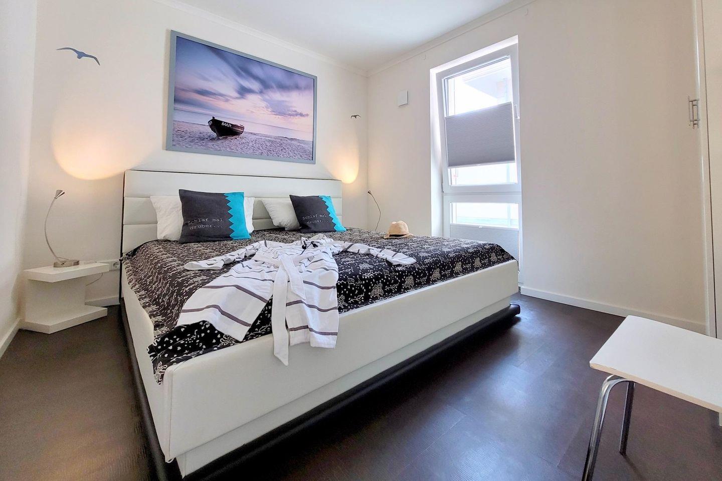 ZWEI modern eingerichtete SCHLAFZIMMER empfangen Sie jeweils mit bequemem Doppelbett (hochwertige Kaltschaum-Matratzen/ getrennt 180 x 200 cm. Die Wohnung ist mit je 4 Sets an Standardbettdecken 135 x 200 cm und Komfort Bettdecken 155 x 220 cm ausgestattet. (Bitte beachten Sie: Für die Komfort Bettdecken kann keine Bettwäsche gestellt werden.) Ein raumhoher Kleiderschrank bietet ausreichend Platz für Ihr Gepäck. Eines der Schlafzimmer verfügt über einen eigenen Zugang zur Terrasse. Das andere ist mit einem Sound-System sowie einem angrenzenden Wannenbad ausgestattet. In der Unterkunft befindet sich zudem ein ZWEITES BAD mit bodengleicher Walk-In Regendusche, großer Spiegelfront, Föhn und einem Fenster, durch das Sie die Morgensonne begrüßt.
