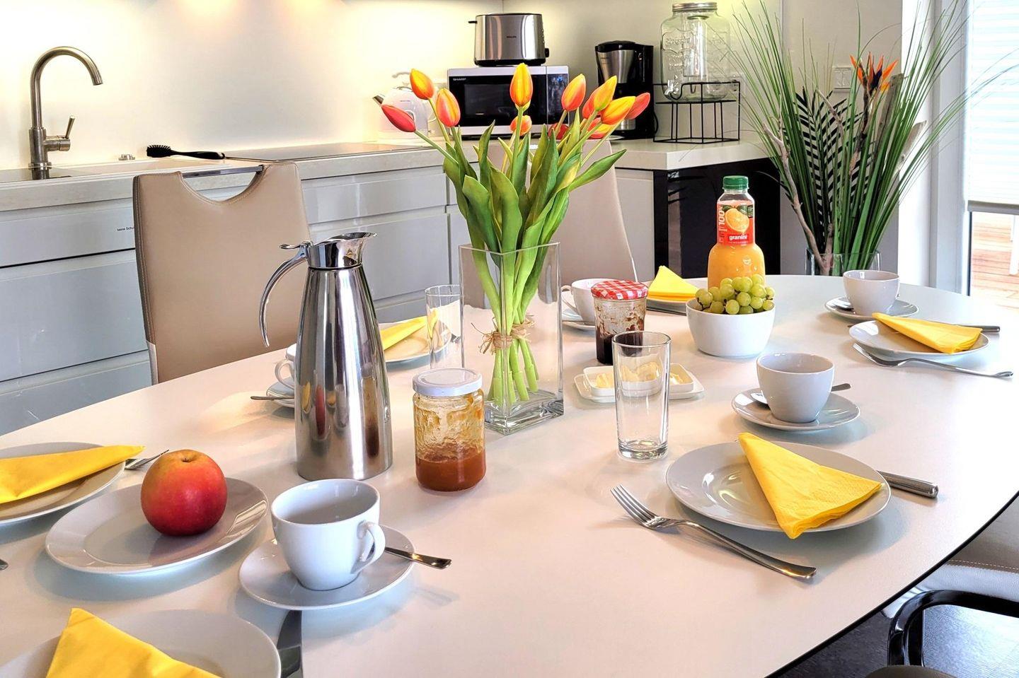 Der moderne, lichtdurchflutete WOHNRAUM empfängt Sie mit einer gemütlichen Leder-Ecksitzgruppe, einem Couchtisch sowie einem Flatscreen-TV mit Blu-ray- / DVD-Player und einer HiFi-Anlage (mit kabelloser Wiedergabe vom eigenen Smartphone/Tablet). Ein großer Tulip-Esstisch mit Stühlen lädt zu gemeinsamen Mahlzeiten ein.