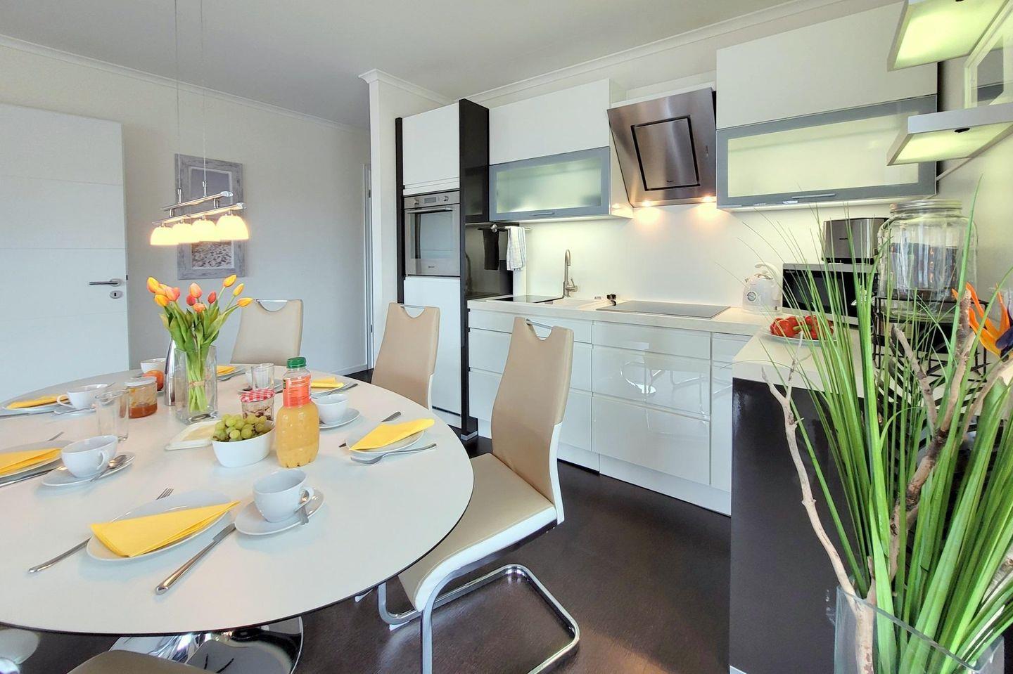 Die hochwertig eingerichtete EINBAUKÜCHE ist voll ausgestattet mit Geschirrspüler, Kühlschrank, inklusive Gefrierfach, Backofen, Mikrowelle, Induktions-Kochfeld, Dunstabzugshaube, Kaffeemaschine, Wasserkocher und Toaster.