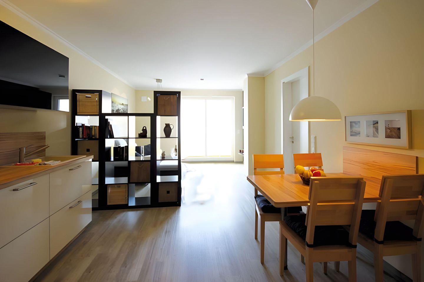 zum Essbereich mit Tisch und vier Stühlen. Zum Kochen stehen Ihnen zwei