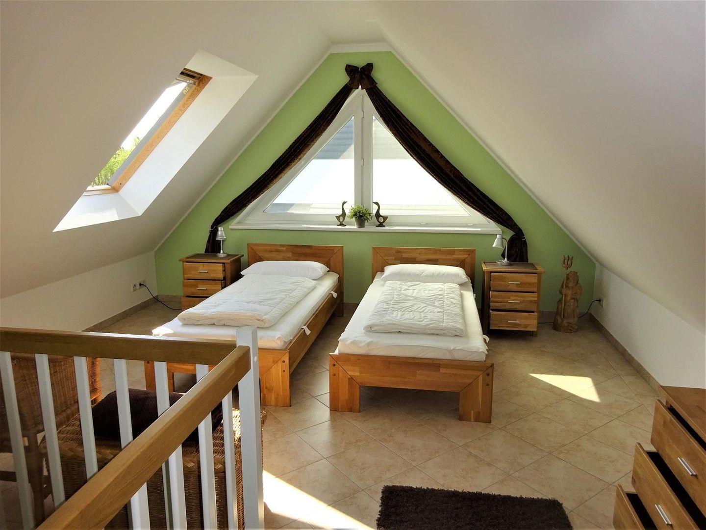 Schlafgalerie mit zwei großen Einzelbetten (zusammenstellbar). Die in der