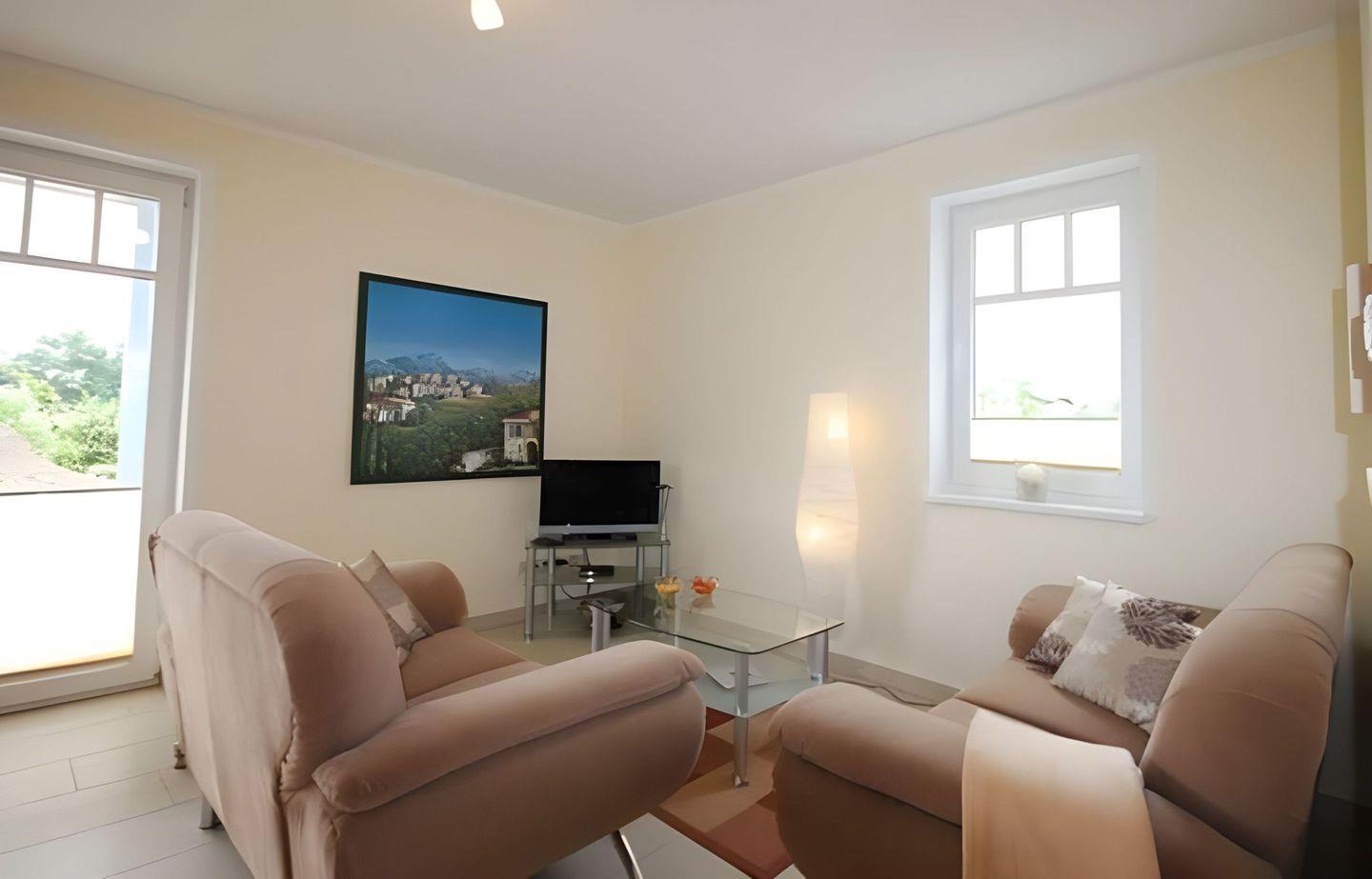 In einem Schlafzimmer befinden sich zwei Einzelbetten und ein TV-Gerät, im zweiten Schlafzimmer steht ein komfortables Doppelbett für Sie bereit. Im lichtdurchfluteten Wohn-Essraum ist eine voll ausgestattete Einbauküche mit einem Vier-Kochplatten-Herd. Für Gemütlichkeit sorgt eine Fußbodenheizung. Ein Duschbad gehört selbstverständlich auch zu der Ferienwohnung.