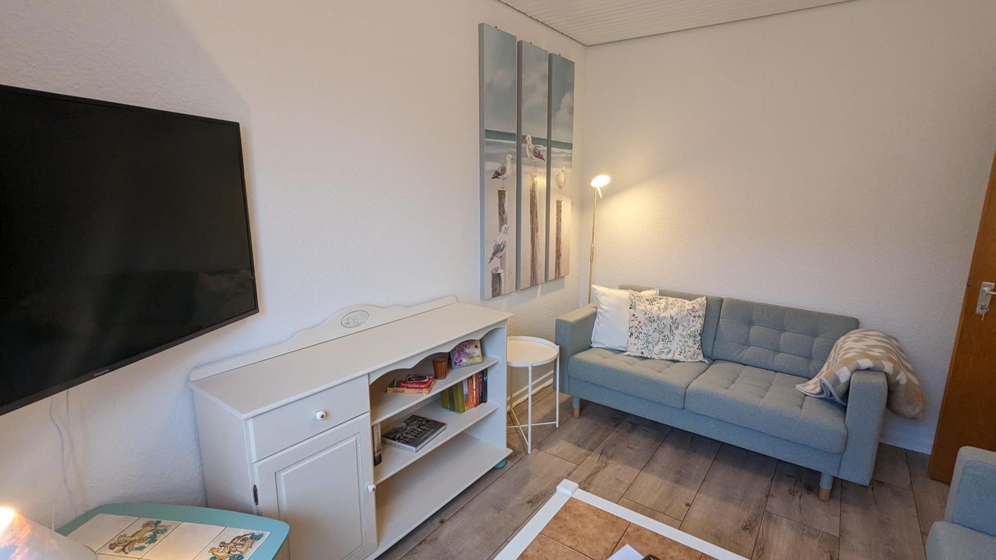 Neben einem neuen Gäste-WC im Eingangsbereich gibt es im 1. Obergeschoss ein neues Badezimmer mit Dusche und Fußbodenheizung und ein gemütliches kleines Wohnzimmer mit Smart-TV, Glasfaser-WLAN, Radio, CD-Player und portablem Bluetooth-Lautsprecher.