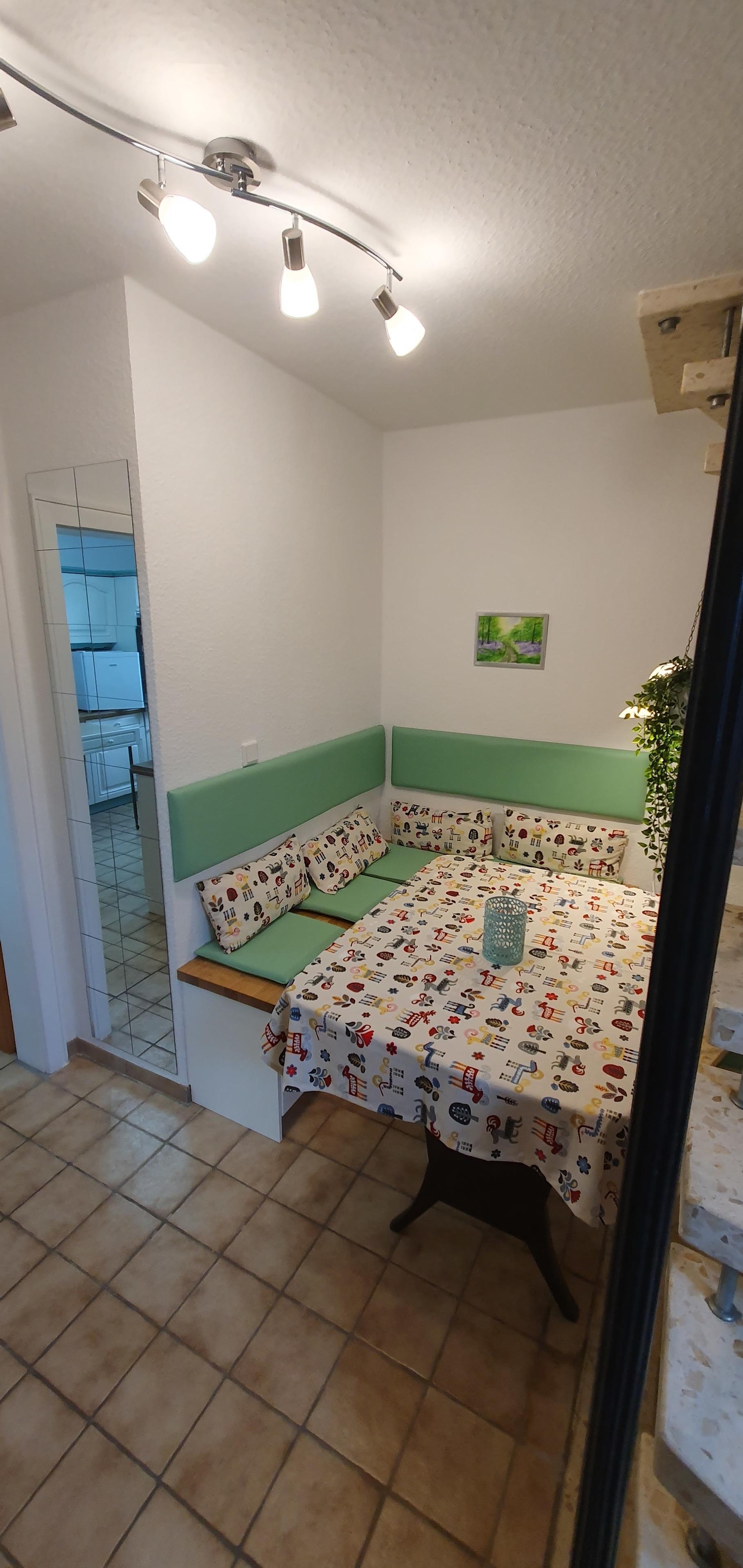 Die farblich aufgefrischte alte Holzküche im Erdgeschoss verfügt über einen kleinen Ausziehtisch sowie Umluft-Backofen, vier Ceran-Kochfelder, Dunstabzug, Mikrowelle, Spülmaschine, Kühlschrank, Mini-Gefrierschrank, Toaster, Kaffeemaschine, Zitruspresse, Mixer und Wasserkocher. Für gemeinsame Mahlzeiten und Spieleabende wurde in der kleinen Diele neben der Küche eine gemütliche Sitzecke mit Stauraum für eine schöne Auswahl an Gesellschaftsspielen eingebaut.