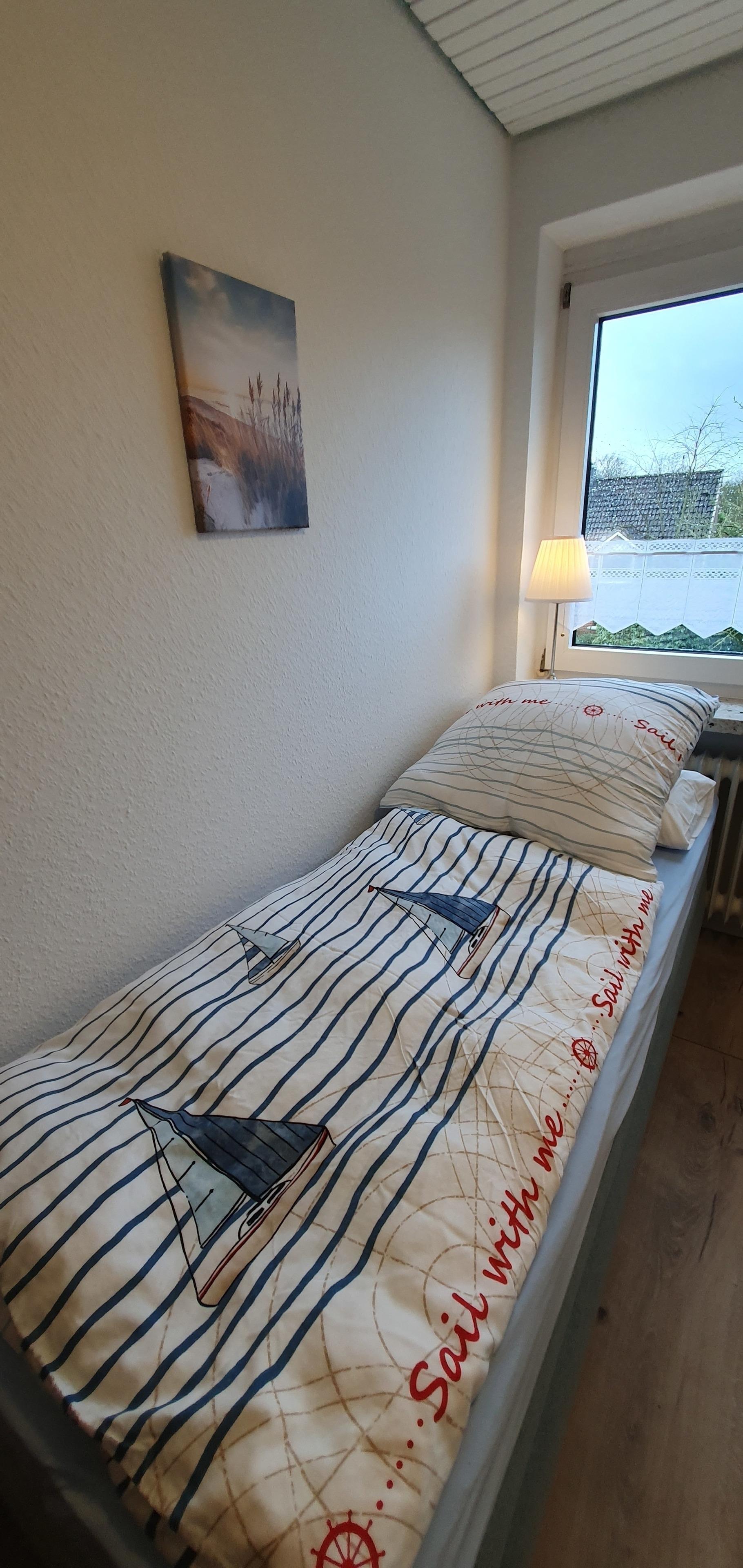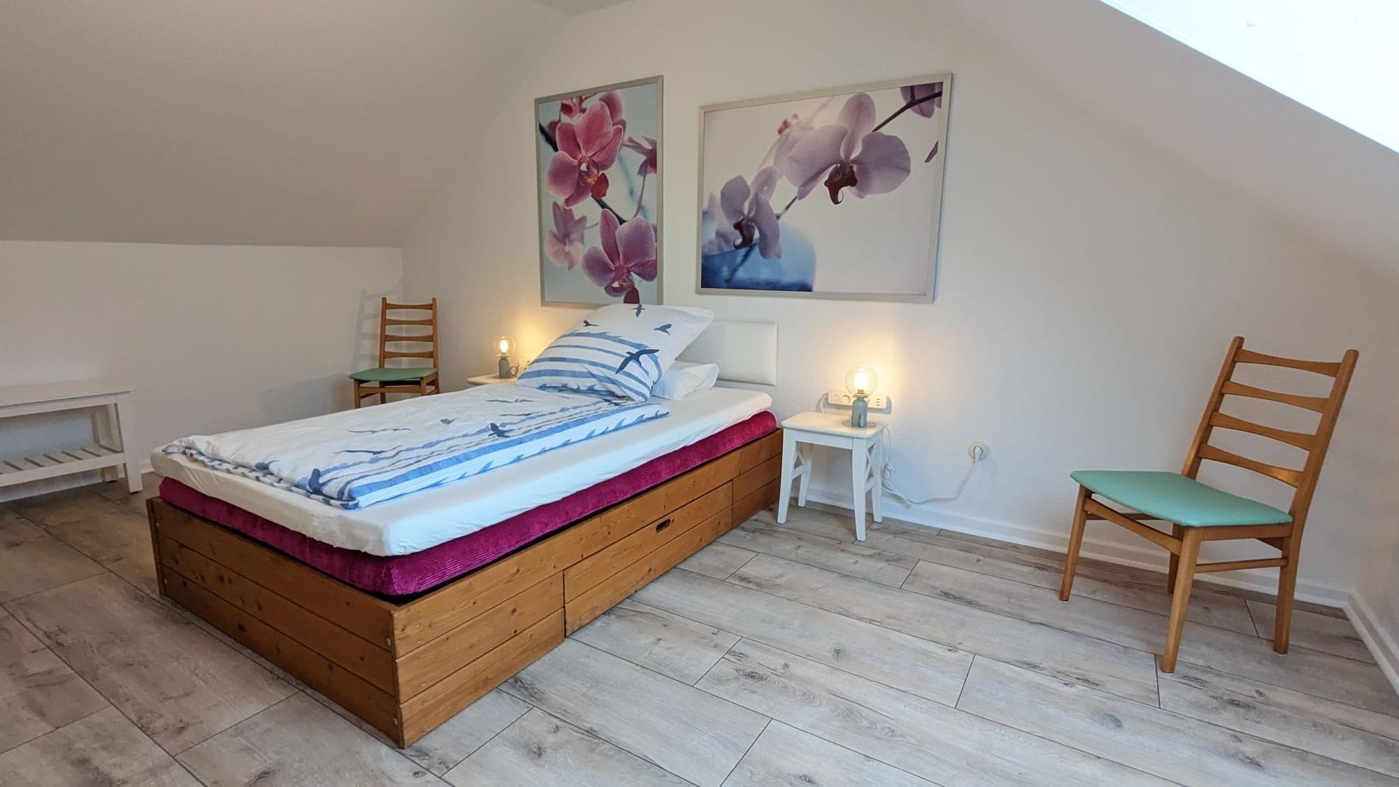 Das Haus für max. 5 Personen besticht durch einen Mix aus neuem und liebevoll aufgearbeitetem Mobiliar. Es verfügt über 1 großes Schlafzimmer mit 2 zusammenstehenden Boxspringbetten à 90 x 200 cm, 1 kleines Schlafzimmer mit 2 Boxspringbetten à 80 x 200 cm (jeweils ca. 60 cm hoch) und ein Dachstudio mit einer Art Futon Bett 130 x 200 cm (ca. 50 cm hoch).
