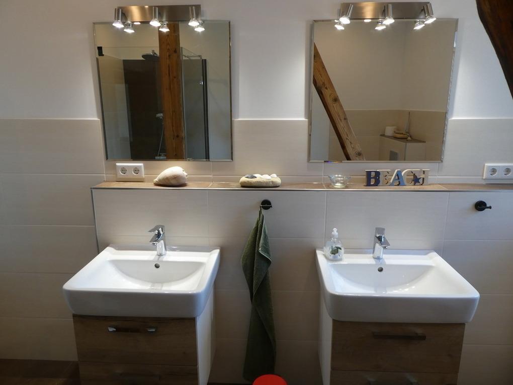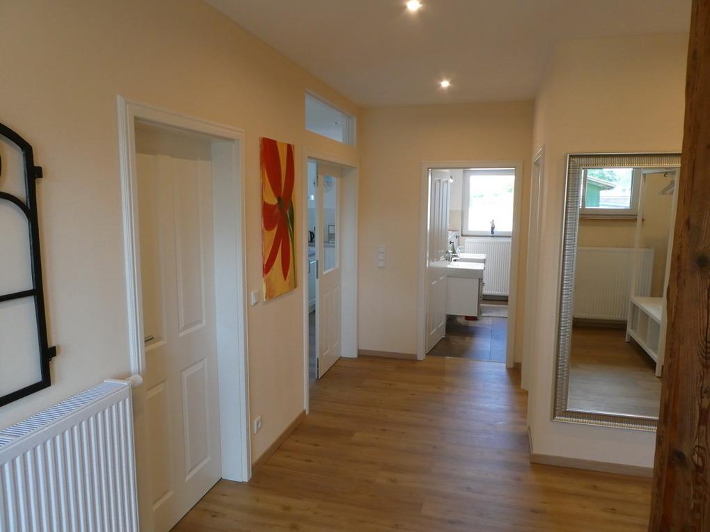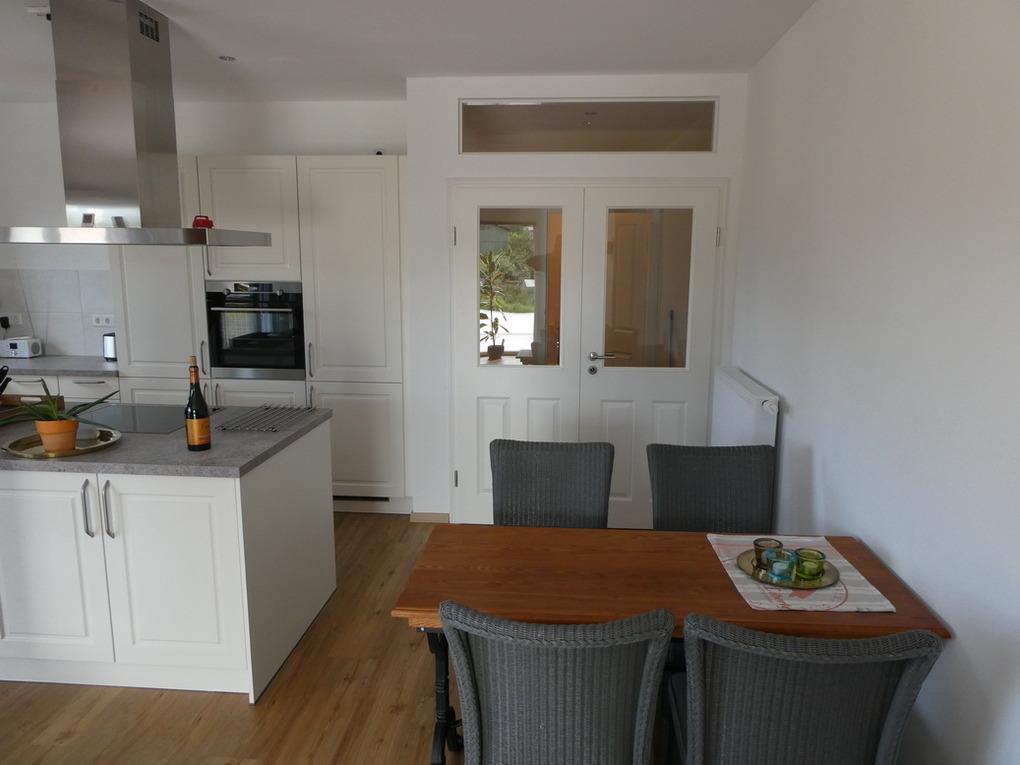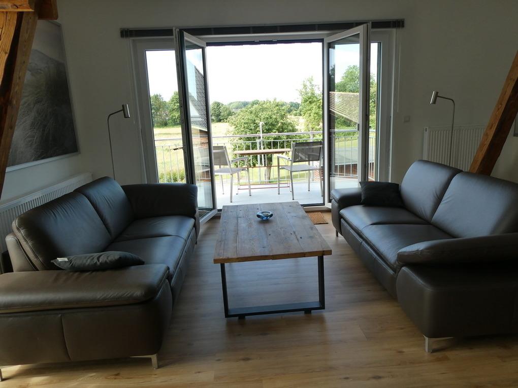 Die Wohnung verfügt über zwei Schlafzimmer (eines davon mit Flachbildfernseher), einem Badezimmer mit Glas-Duschbad, einem Gäste-WC inkl. Waschmaschine und Trockner sowie einem großen Wohnraum mit offener Küche, freistehender Kochinsel mit Induktionsherd und integriertem Essbereich. Eingangs-, Wohn- und Küchenbereich sowie Schlafräume und Gäste-WC sind mit Vinyl-Fußboden in einer warmen Holzfarbe ausgelegt. Zwei Ledersofas und ein 55- Zoll Flachbildfernseher laden zum Entspannen ein. Vom Balkon mit Süd-West-Ausrichtung hat man einen herrlichen über die Felder. Ein PKW-Stellplatz am Haus ist ebenfalls vorhanden.