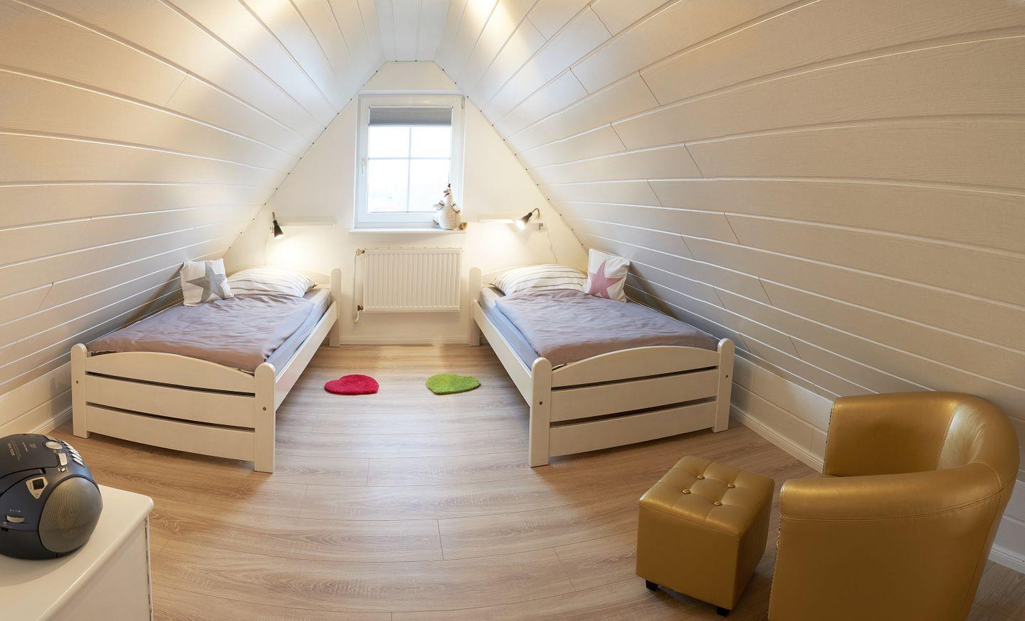 Über eine steile (!) Treppe gelangt man in das Obergeschoss der bezaubernden Ferienwohnung. Hier befinden sich zwei Schlafzimmer mit jeweils zwei Einzelbetten. Auch hier sind die Farben hell und freundlich, passend zum Gesamtbild der Unterkunft. Alle Schlafzimmer verfügen über Verdunklungsplissees und Insektenschutzgitter. Die Treppe ist von unten und oben mit Treppenschutzrollos gesichert, so dass Kleinkinder nicht eigenständig den Weg gehen oder krabbeln können.