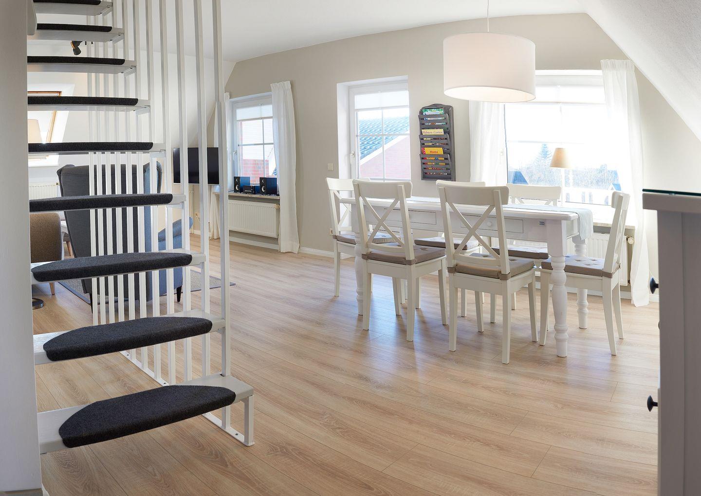 Diese moderne und großzügige Ferienwohnung bietet auf 92qm ausreichend Platz für bis zu sechs Personen in insgesamt drei Schlafzimmern. Die Ferienwohnung befindet sich im Obergeschoss des Hauses, kann auf Grund ihrer Hanglage aber ebenerdig betreten werden. Die Räume der Wohnung wurden im modernen skandinavischen Stil, mit hellen Farben gestaltet und liebevoll mit entsprechenden hellen, gemütlichen Möbeln eingerichtet.