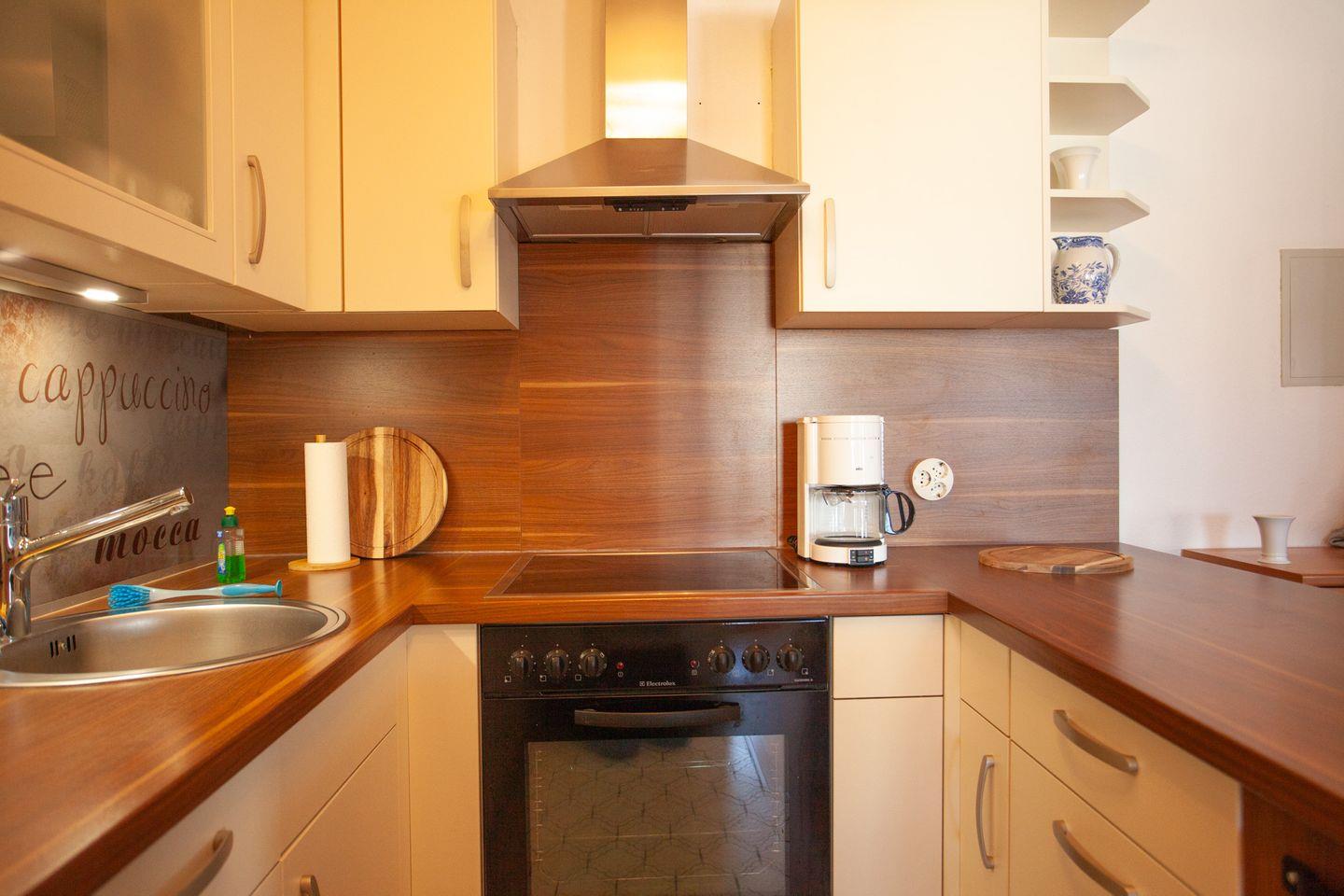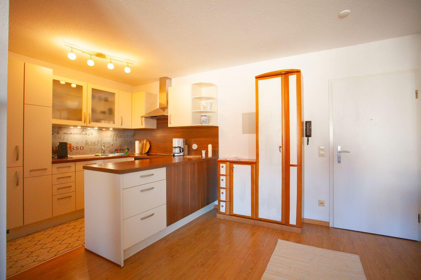 Der offene Wohn- und Essbereich lädt zum Entspannen ein. Große Fenster sorgen für viel Tageslicht, während der angrenzende Balkon einen schönen Platz bietet, um den Tag mit einem Frühstück oder einem Glas Wein ausklingen zu lassen. Die voll ausgestattete Küche bietet alles, was Sie für die Selbstversorgung benötigen und fügt sich harmonisch in den Wohnbereich ein.