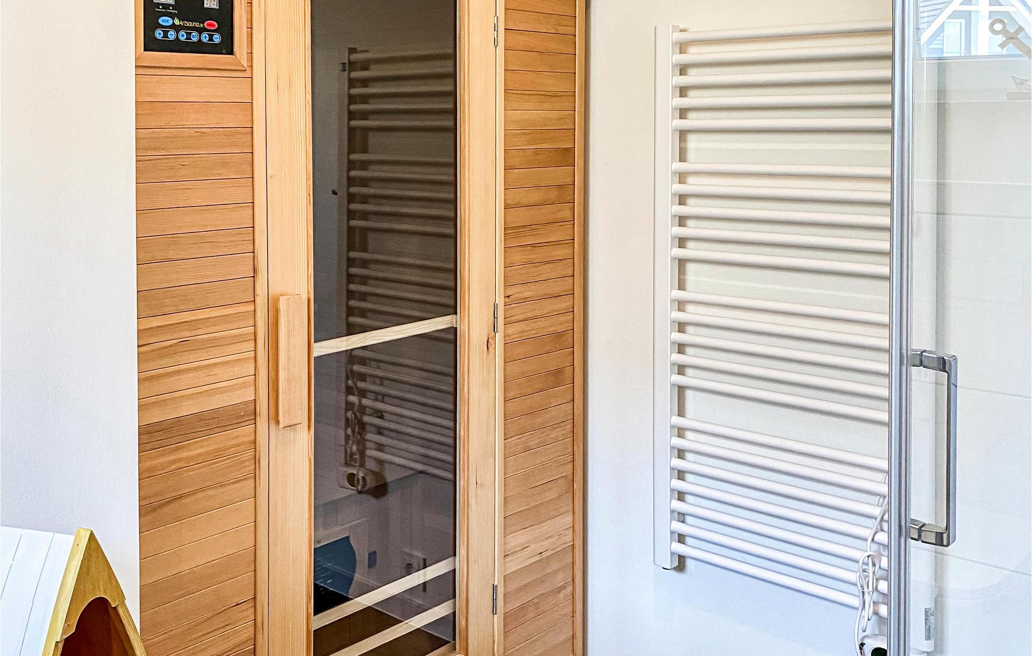 Fra opholdsstuen er der forbindelse til en rummelig terrasse med havemøbler, grill og grønt areal. Saunaen og brændeovnen sørger for ekstra hygge i vinterhalvåret. Husets udstyr inkluderer også to fjernsyn og gratis WiFi. Udendørs finder I parasol, liggestol, sandkasse og badebassin til børn, badminton og boccia.