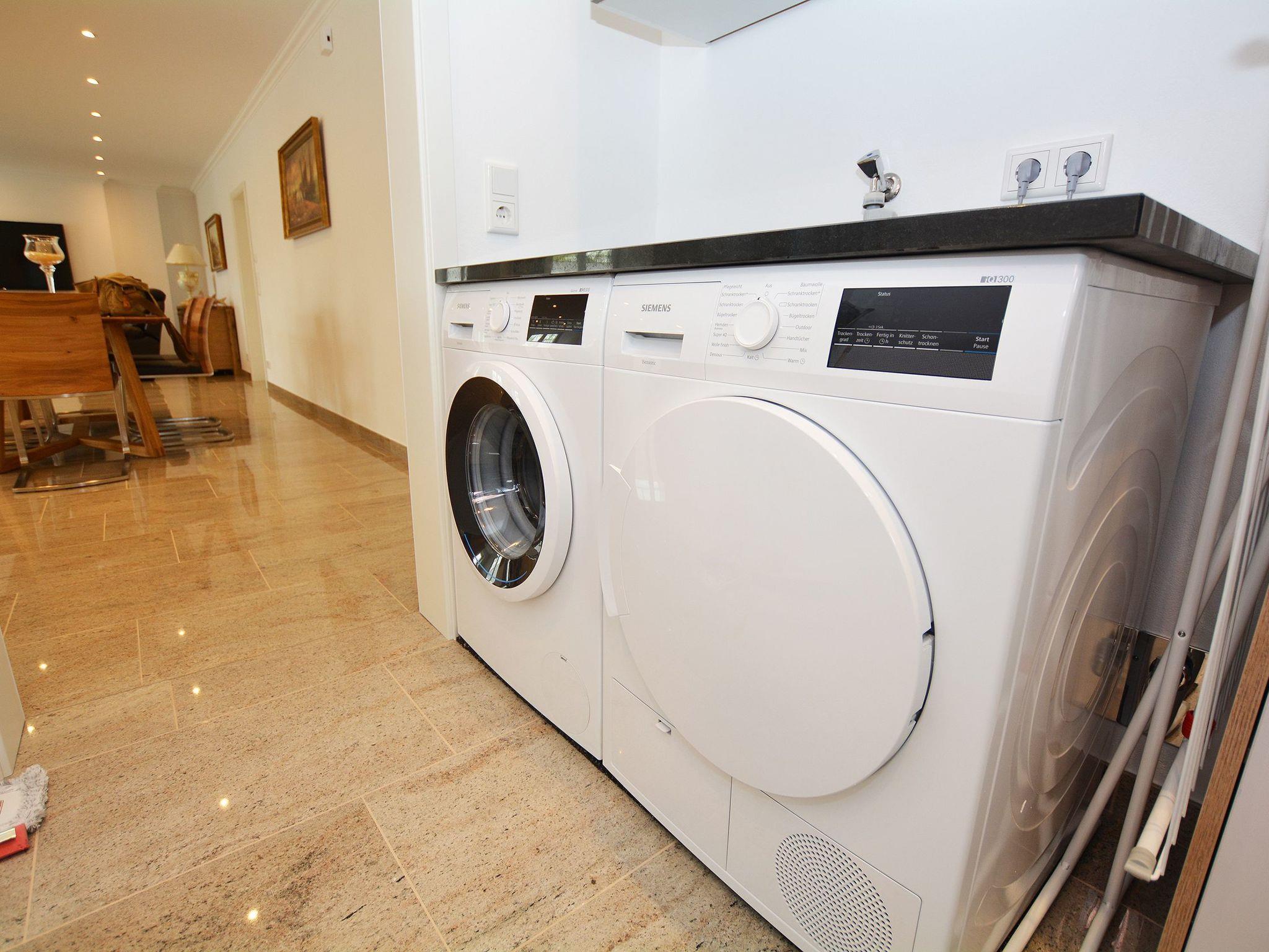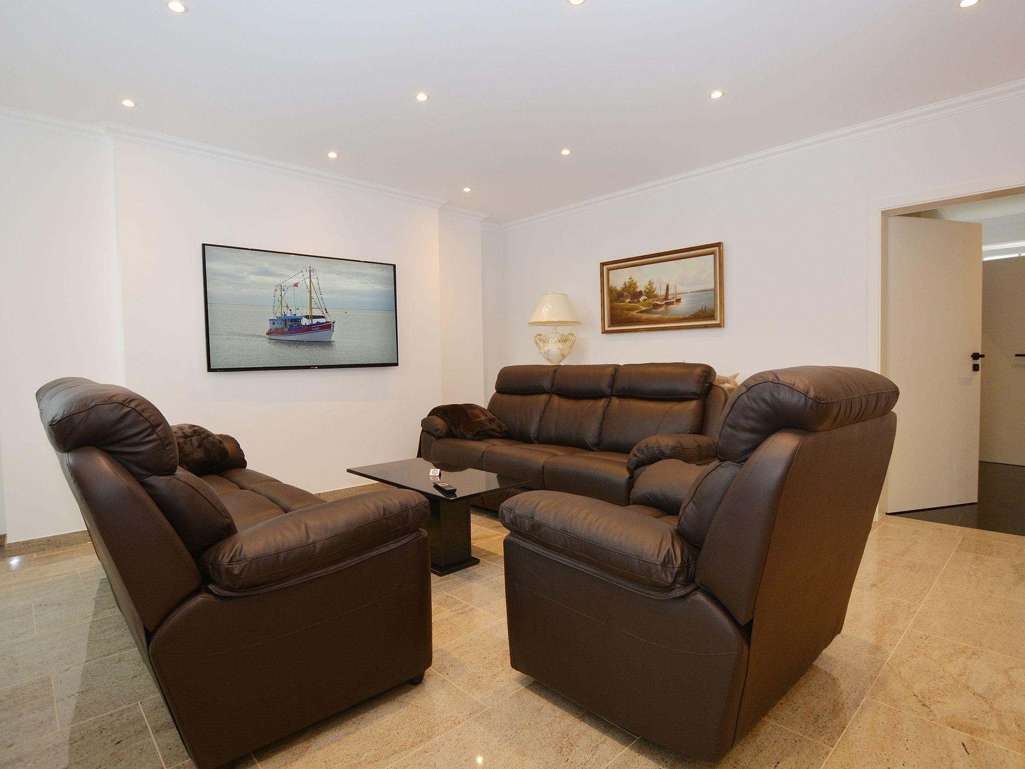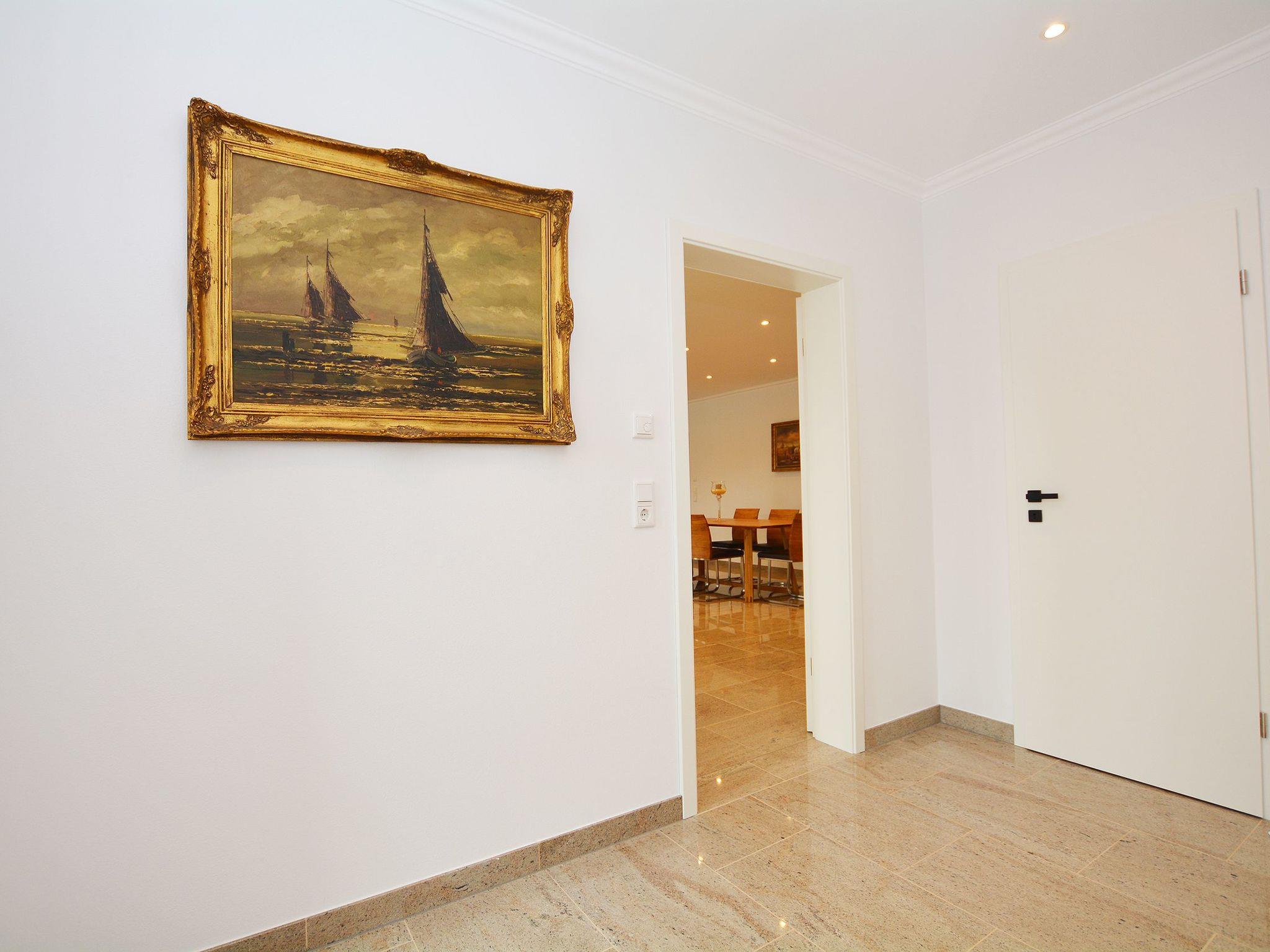 Guest WC: WC + washbasin Utility room: Washing machine + tumble dryer Iron + ironing board Travel cot + baby high chair stored there Office room: Office cupboards and table Internet access Sofa bed Hallway/ entrance: Cloakroom with mirror Terrace/ garden: Furnished and paved terrace with fenced garden Highlights of the holiday flat: 1. All rooms are laid with high-quality natural stone 2. entire flat has underfloor heating, electric external blinds and internal pleated blinds 3. all bedrooms and living room have their own television with internet access 4. entire flat is elegantly and ultra-modernly furnished 5. spacious and light-flooded rooms 6. furnished and paved terrace with its own fenced garden 7. decalcification system