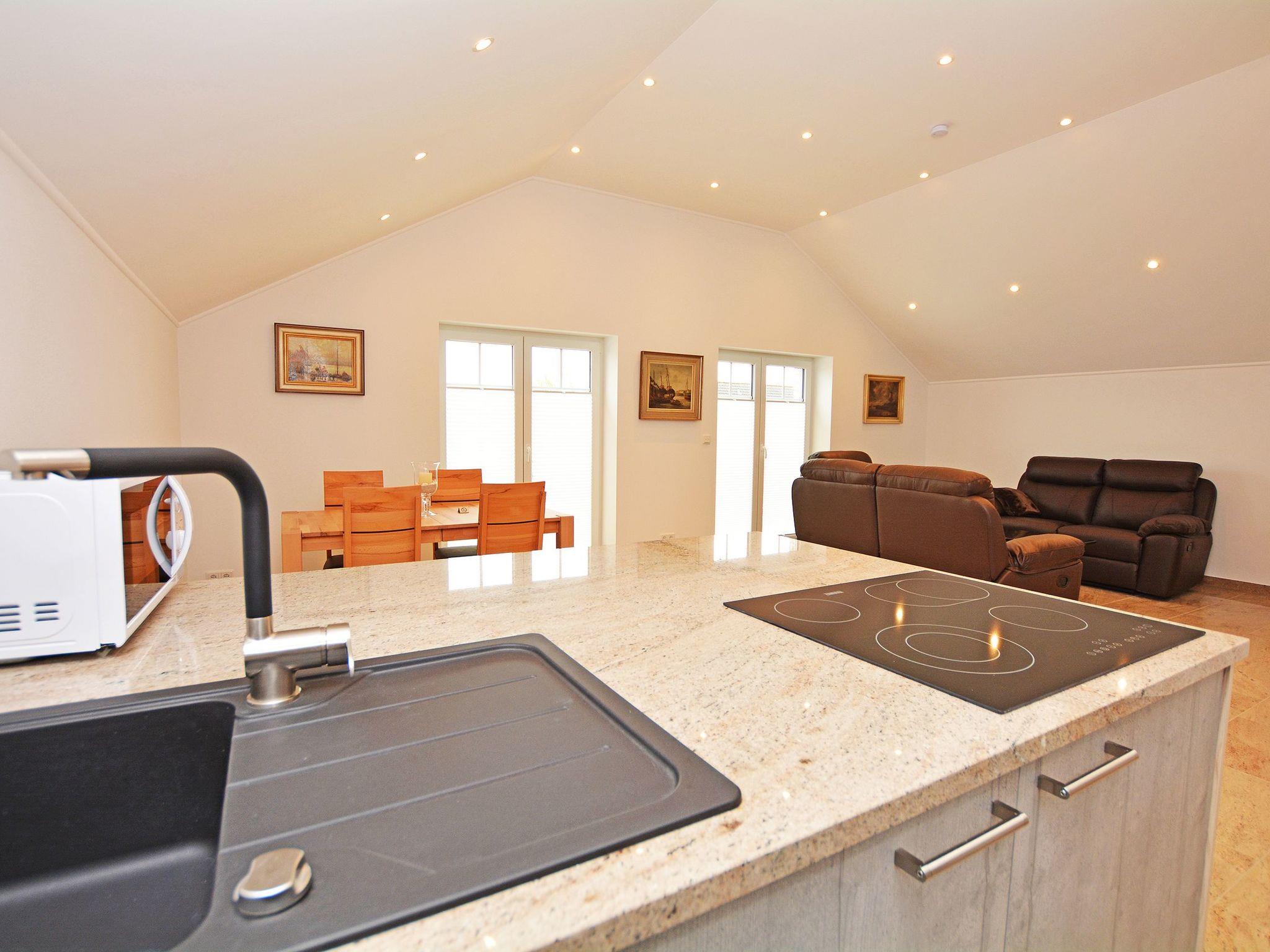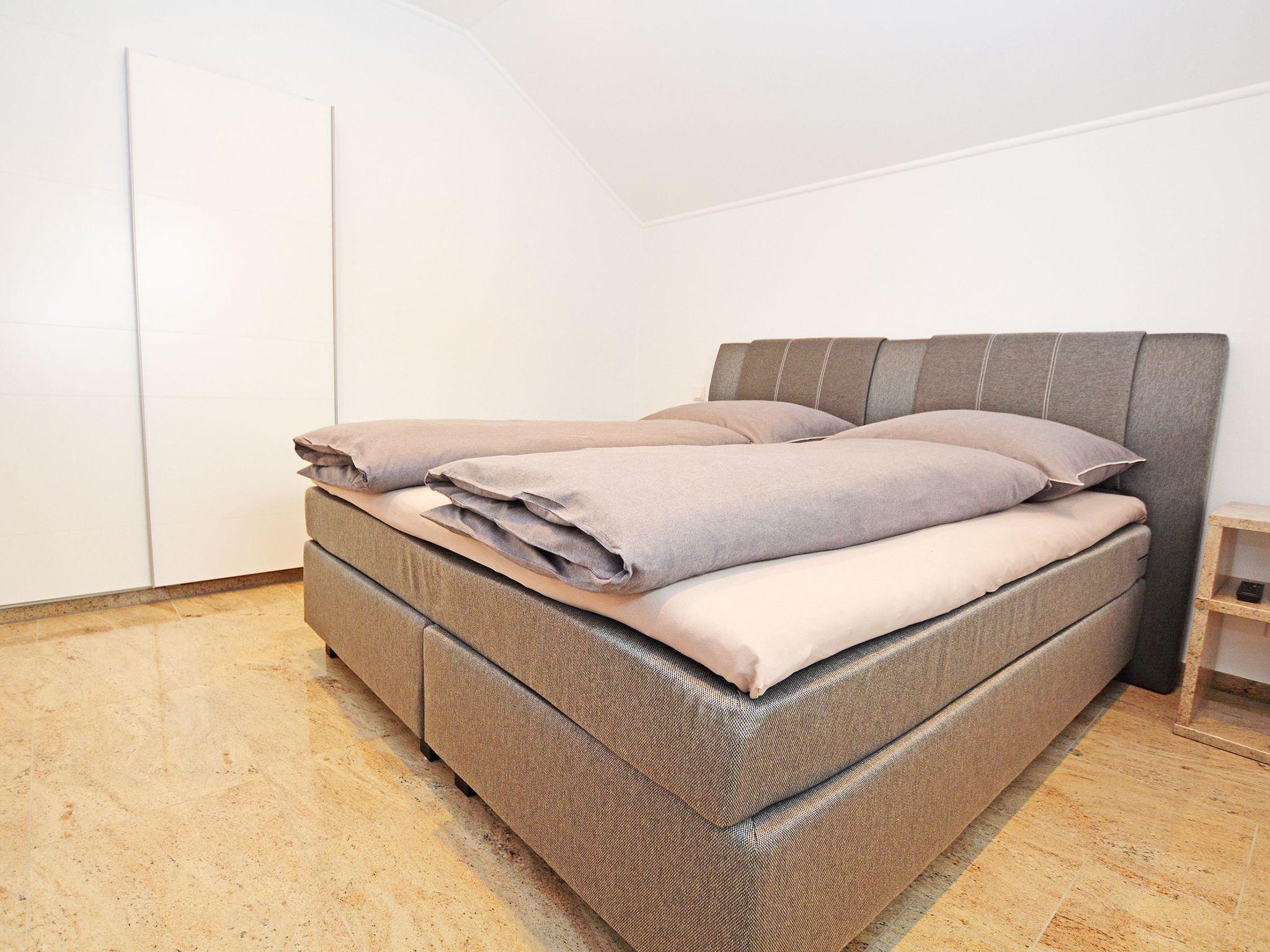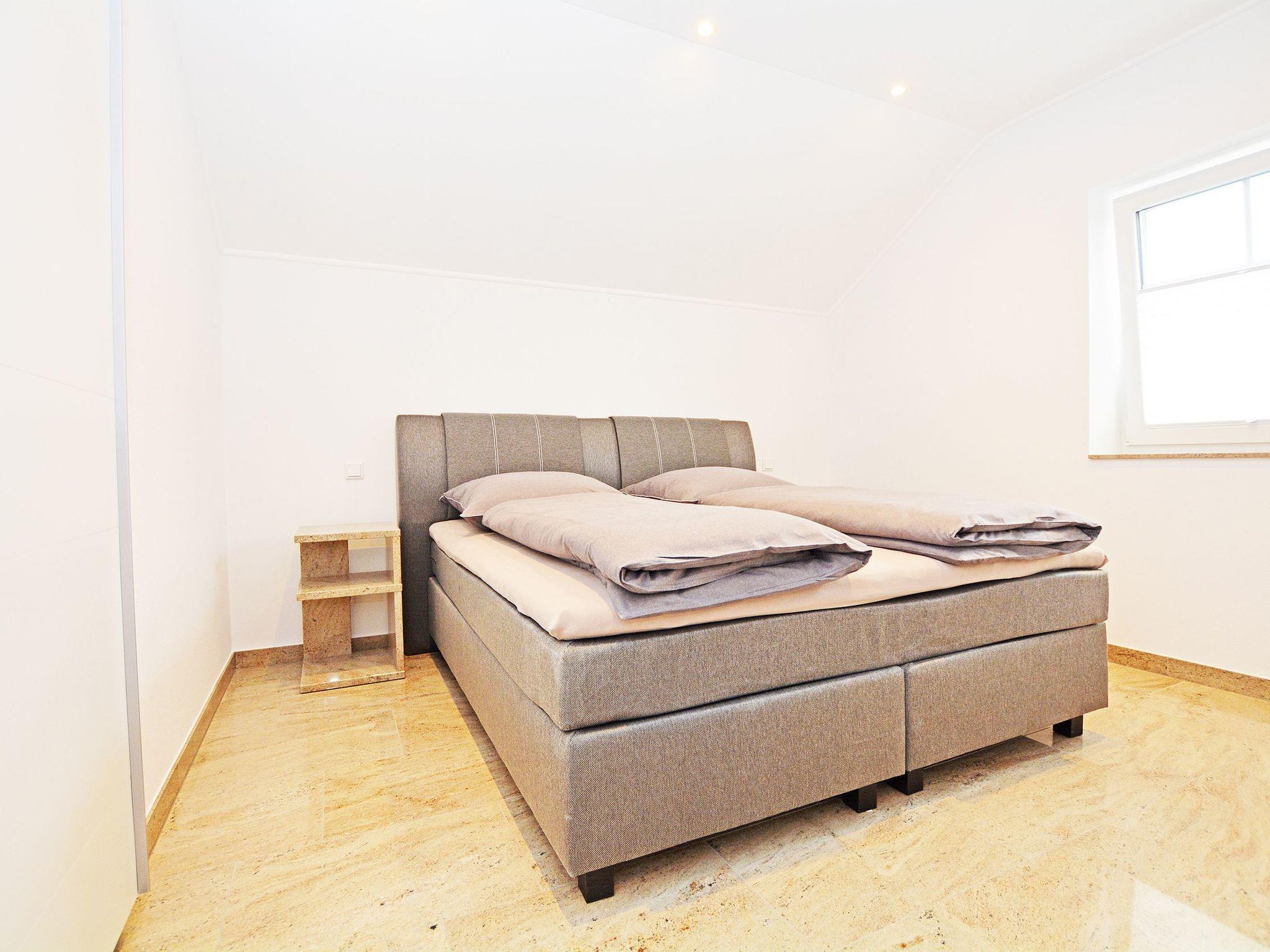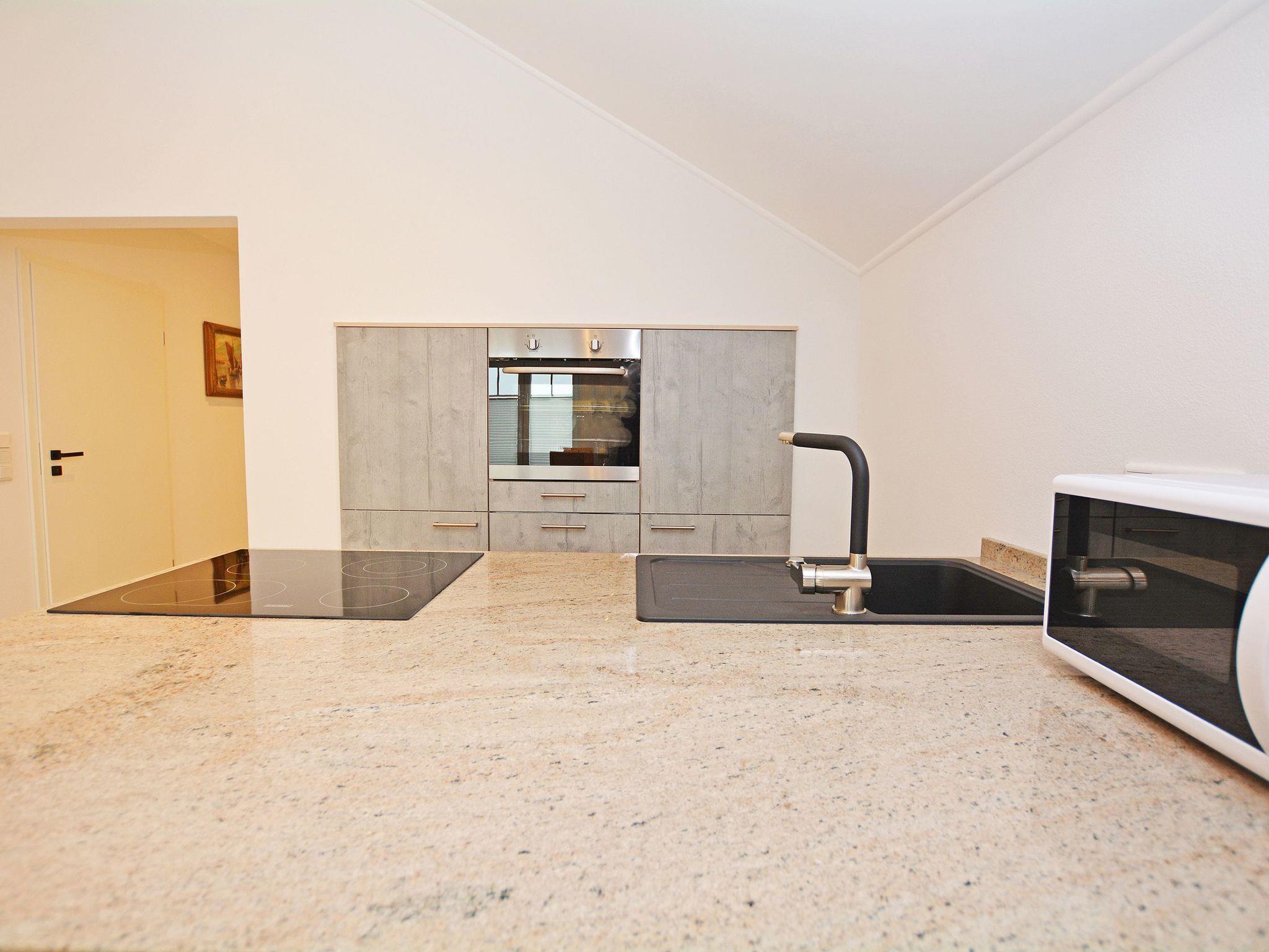 Final cleaning included in the rental price Bed linen included in the rental price Towels included in the rental price Travel cot included in the rental price (optional) High chair included in the rental price (optional) Bedrooms I and II: Box spring bed (200 * 180 cm) Two elegant bedside tables made of high-quality natural stone TV flat screen TV with internet access Wardrobe One bathroom: Rain shower Hand shower WC Hairdryer/ hairdryer holder Washbasin Mirror Approx. 30 sqm open-plan room Consisting of: A) Living room Leather suite TV Natural stone table B) Dining area Spacious dining table with 4 chairs C) Modern kitchen Cooking island with tall units Natural stone kitchen worktop Built-in appliances: Refrigerator, dishwasher, microwave, oven, coffee machine, hob Silgranit sink, kettle, toaster, crockery, towels and household items are available for daily needs.