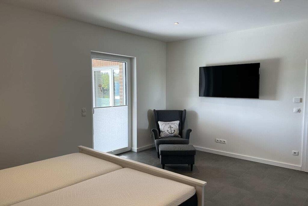 Sie wohnen mit jeglichem Komfort auf 115qm Wohnfläche, Terrasse und großer Rasenfläche. Die perfekte Auszeit - als Familie, Paar oder Freundesgruppe. Ihre Unterkunft bietet 2 Schlafzimmer, 2 Bäder mit Dusche (zusätzlich eine Eckbadewanne), Wohnzimmer mit großem Wohlfühlsofa und Smart-TV, W-LAN, Netzwerkanschluss in jedem Zimmer, moderne Küche, großzügigem Essbereich. Keine Stufen vom Parkplatz ins Haus und auf die Terrasse.