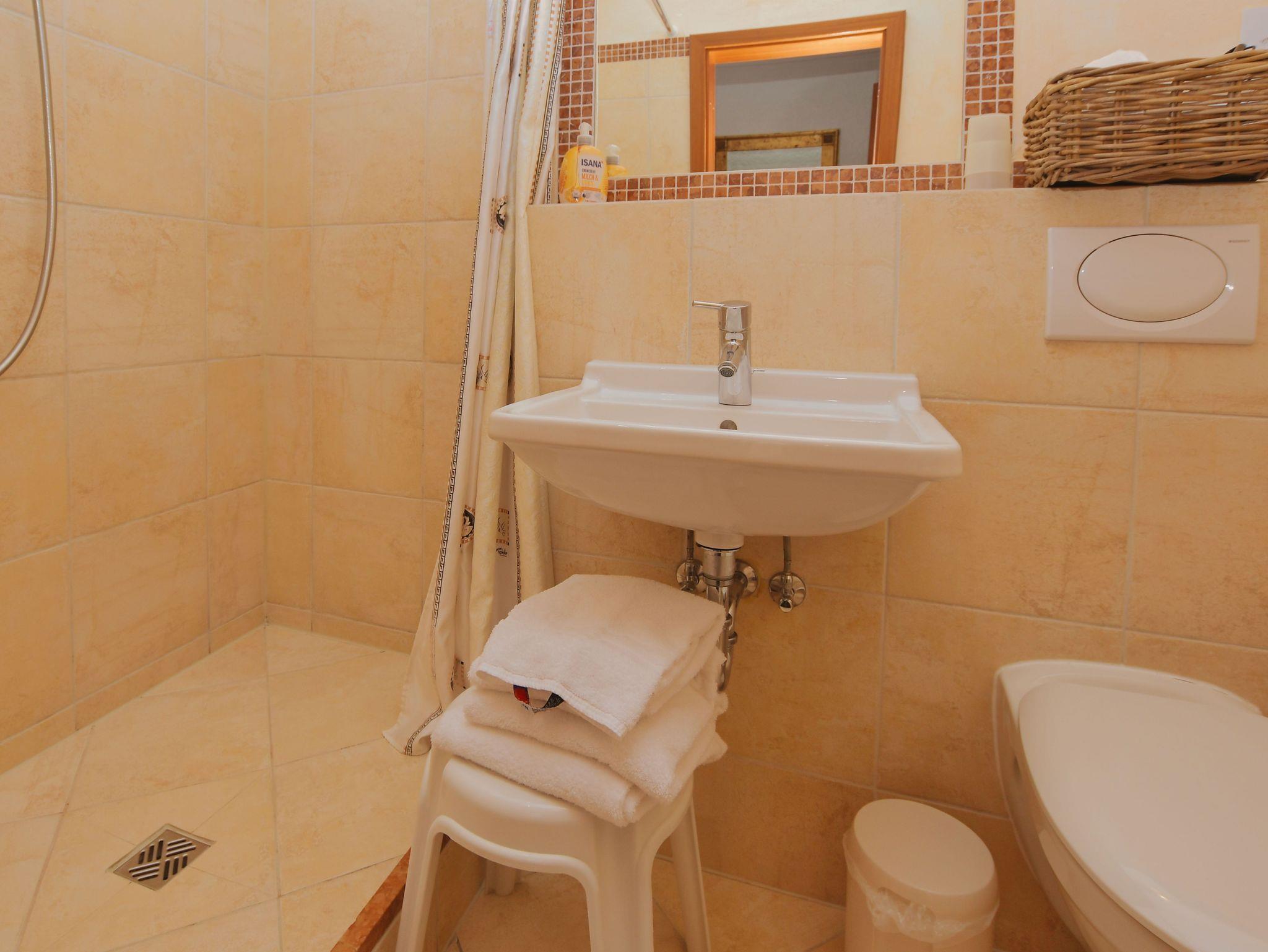 • Duschbad/WC, Waschtisch, großer Spiegel, ausreichend Ablageflächen.