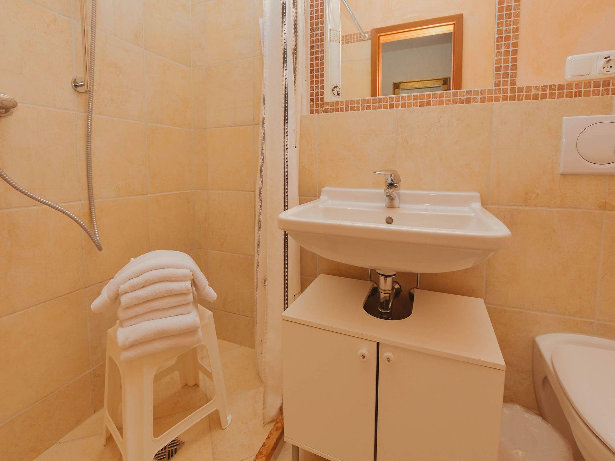 Duschbad/WC, Waschbecken mit großem Spiegel, ausreichend Ablageflächen, Fußbodenheizung, Handtuchtrockner und Radio.
