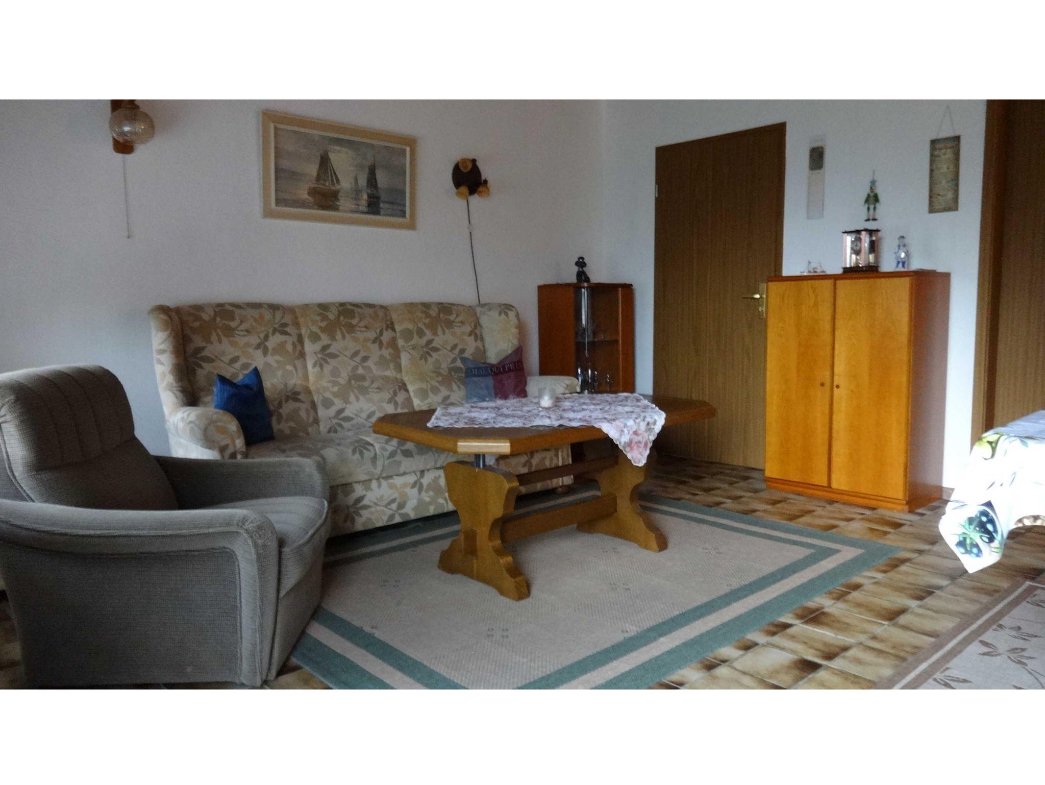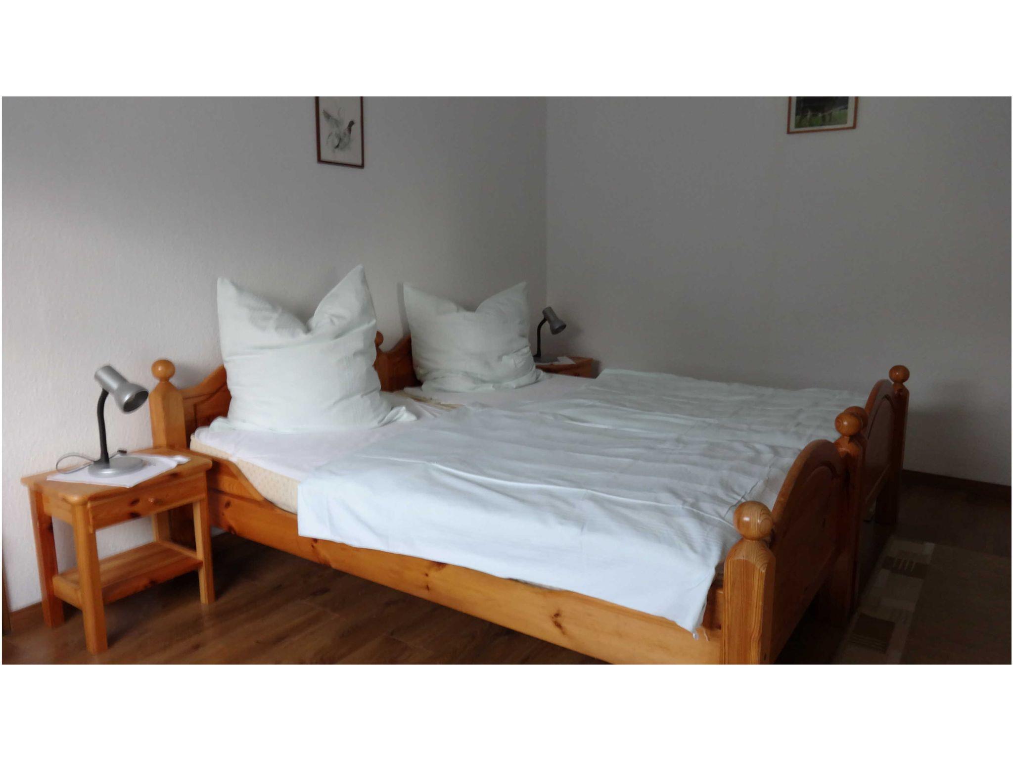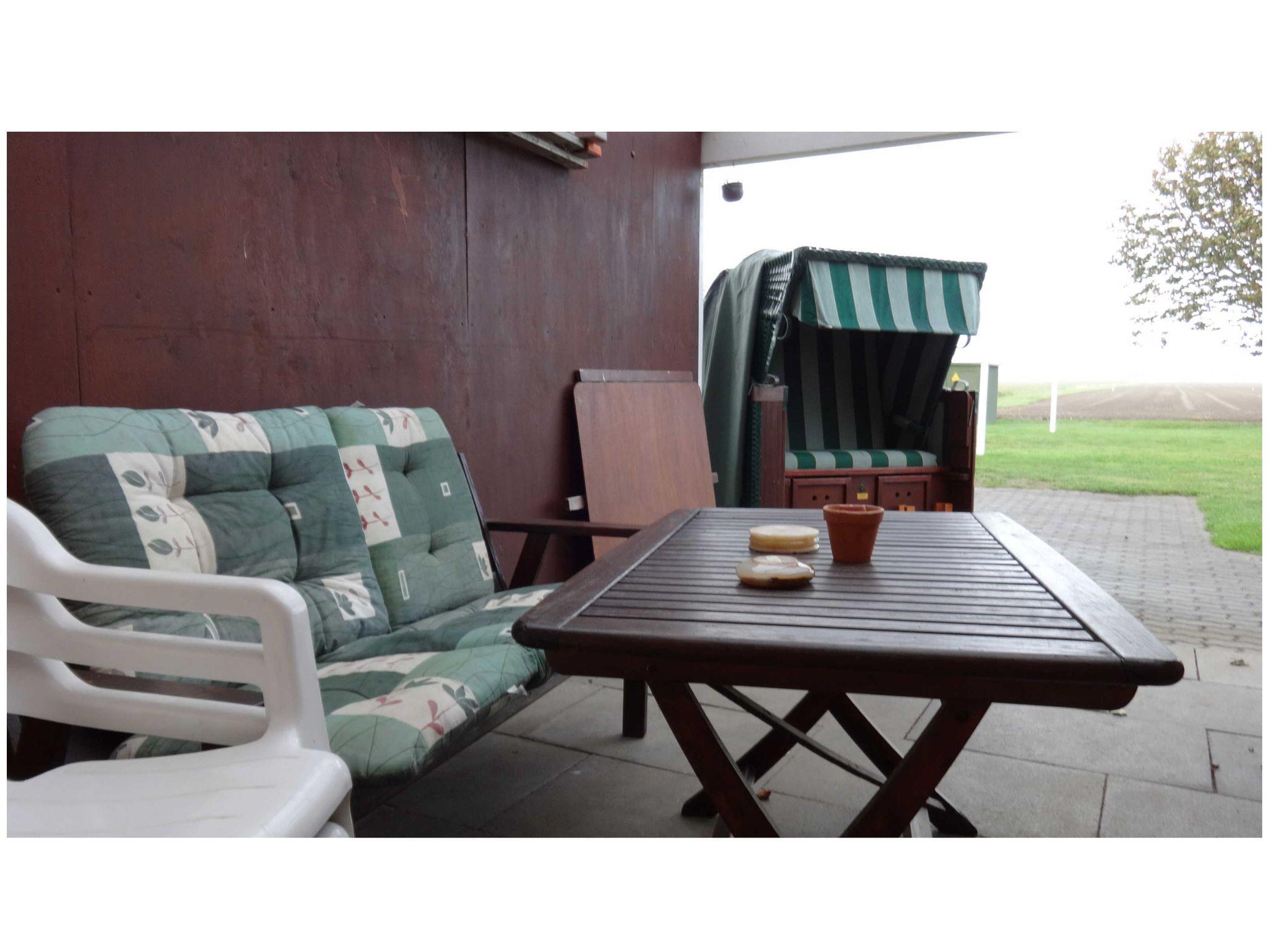 Im großen Wohnzimmer befindet sich die Eßecke und eine Couchgarnitur, Farbfernsehrer. Zwei hintereinander liegende Schlafzimmer. Beide mit Doppelbett. Kinderbett auf Wunsch. Alle Räume mit wischbaren Böden. Wohnzimmer mit Fliesen, beide Schlafzimmer mit Laminat. Duschbad ohne Stolperkanten durchgefliest. Separate Küche mit 4-Platten-Herd und Backofen, Kaffeemaschine, Toster und allem notwendigen Geschirr. Die Fenster haben Außenrolläden. Überdachte Terrasse.
