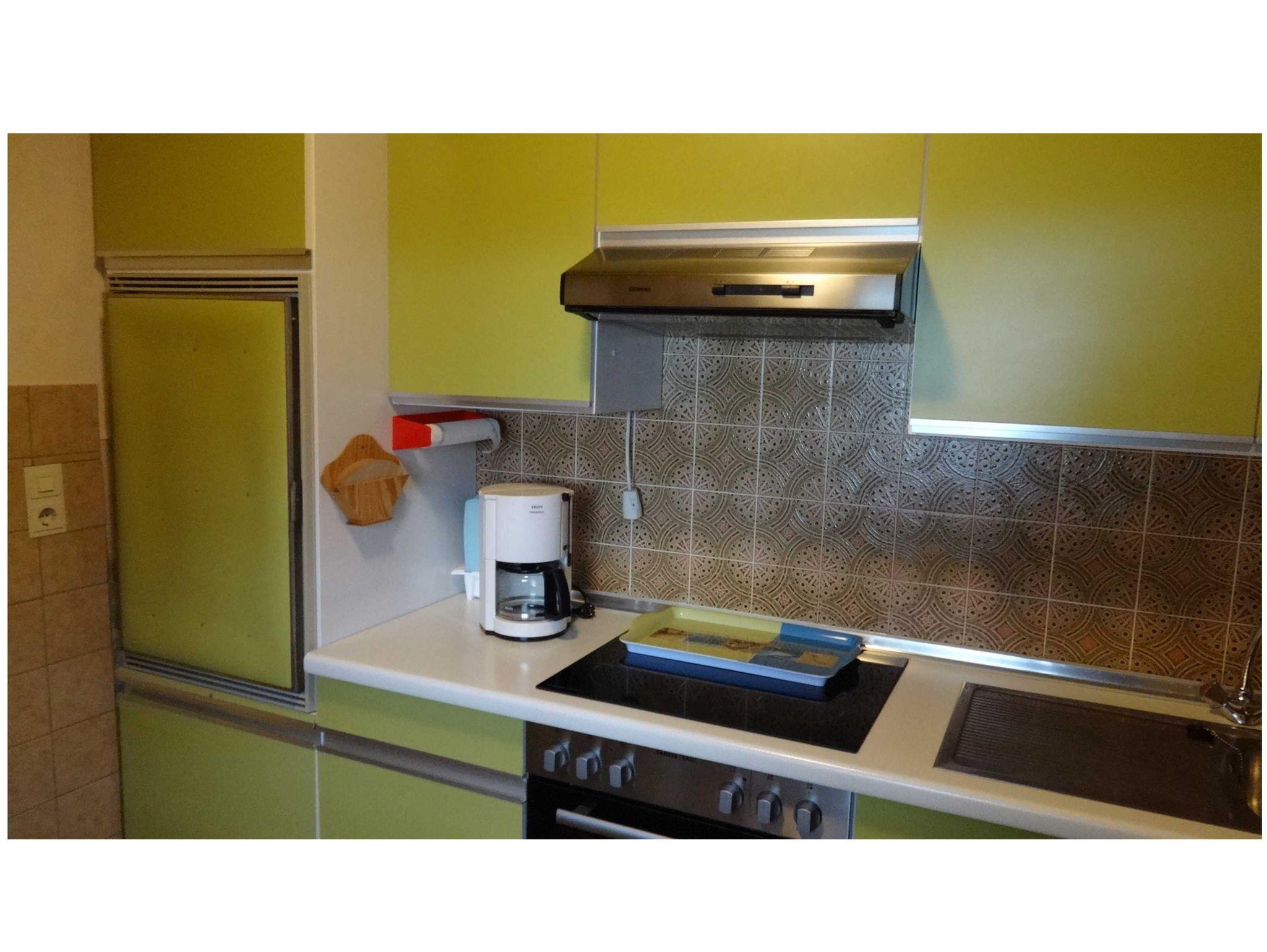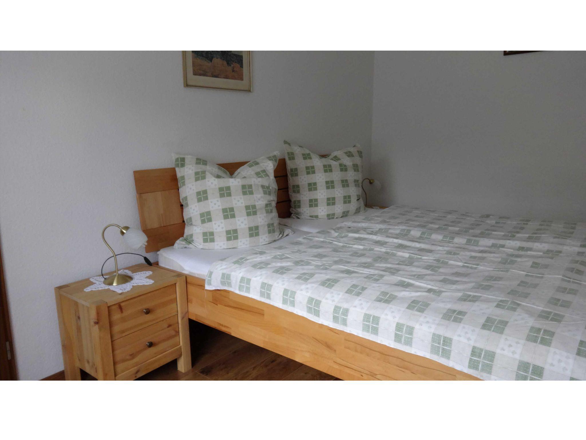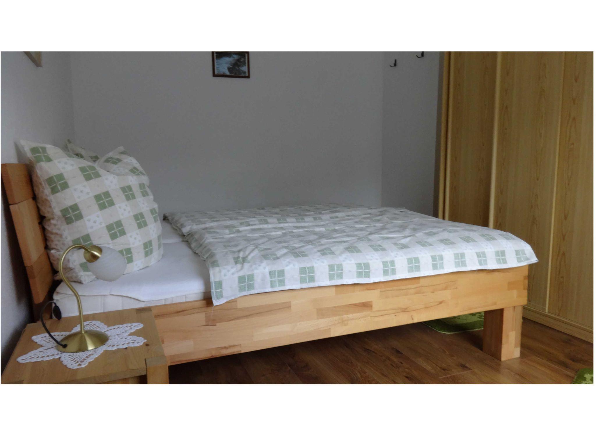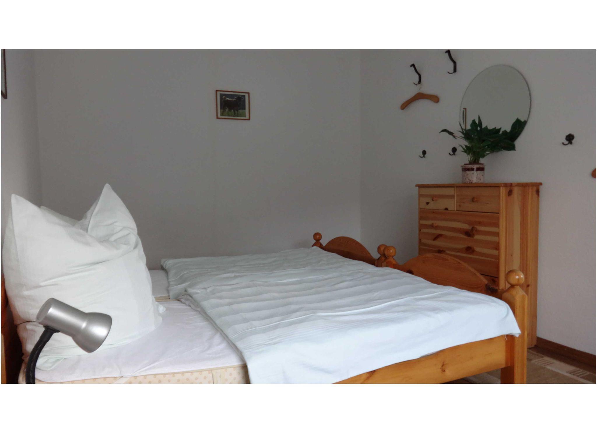 Im großen Wohnzimmer befindet sich die Eßecke und eine Couchgarnitur, Farbfernsehrer. Zwei hintereinander liegende Schlafzimmer. Beide mit Doppelbett. Kinderbett auf Wunsch. Alle Räume mit wischbaren Böden. Wohnzimmer mit Fliesen, beide Schlafzimmer mit Laminat. Duschbad ohne Stolperkanten durchgefliest. Separate Küche mit 4-Platten-Herd und Backofen, Kaffeemaschine, Toster und allem notwendigen Geschirr. Die Fenster haben Außenrolläden. Überdachte Terrasse.