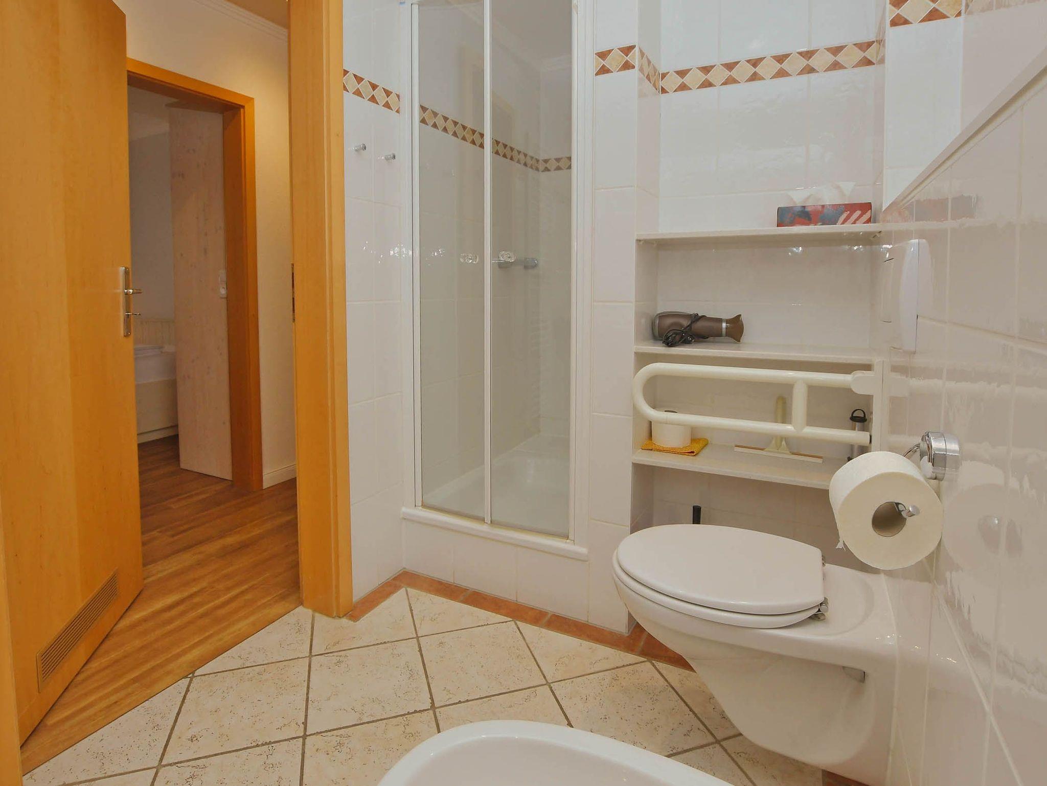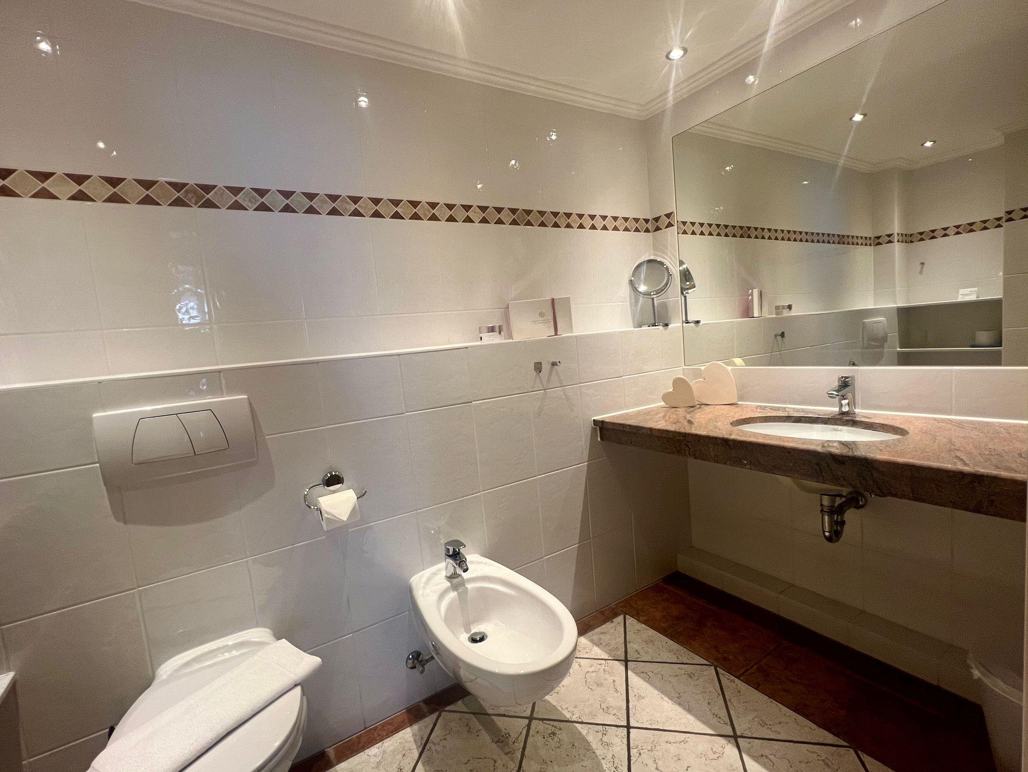 Unsere Bäder im Neubautrakt sind ausgestattet mit Dusche, WC, Bidet, großem Waschtisch mit Spiegel, ausreichend Ablageflächen, Fußbodenheizung, Handtuchtrockner und Radio.