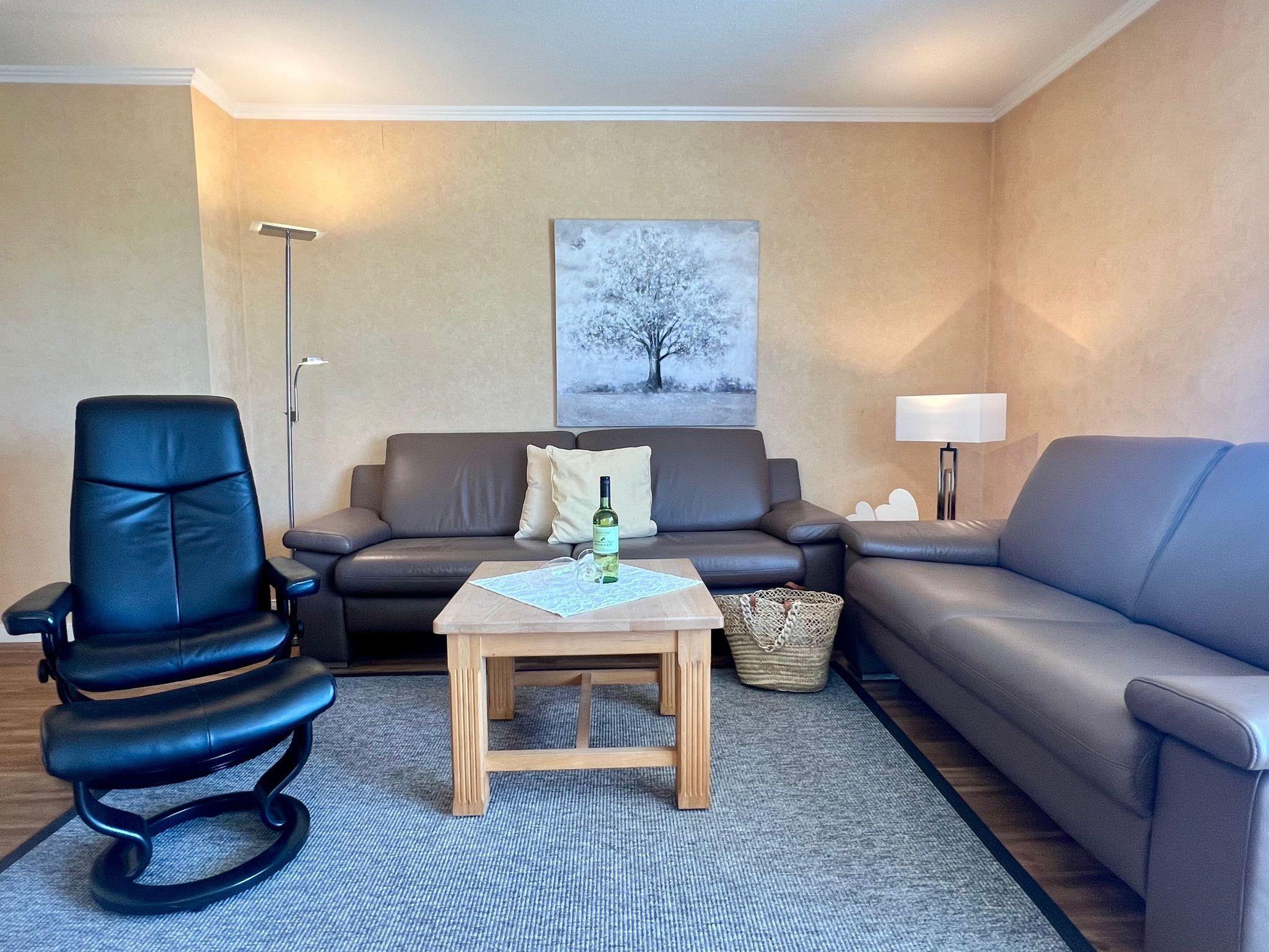 Appartement mit zwei Schlafzimmern und Balkon. Die Schlafzimmer sind ruhig gelegen zur Rückseite des Hauses. Sie sind geräumig mit großen Kleiderschränken und einem Ganzkörperspiegel. Wohnzimmer mit Sitzgruppe, Eßplatz und Küchenzeile.