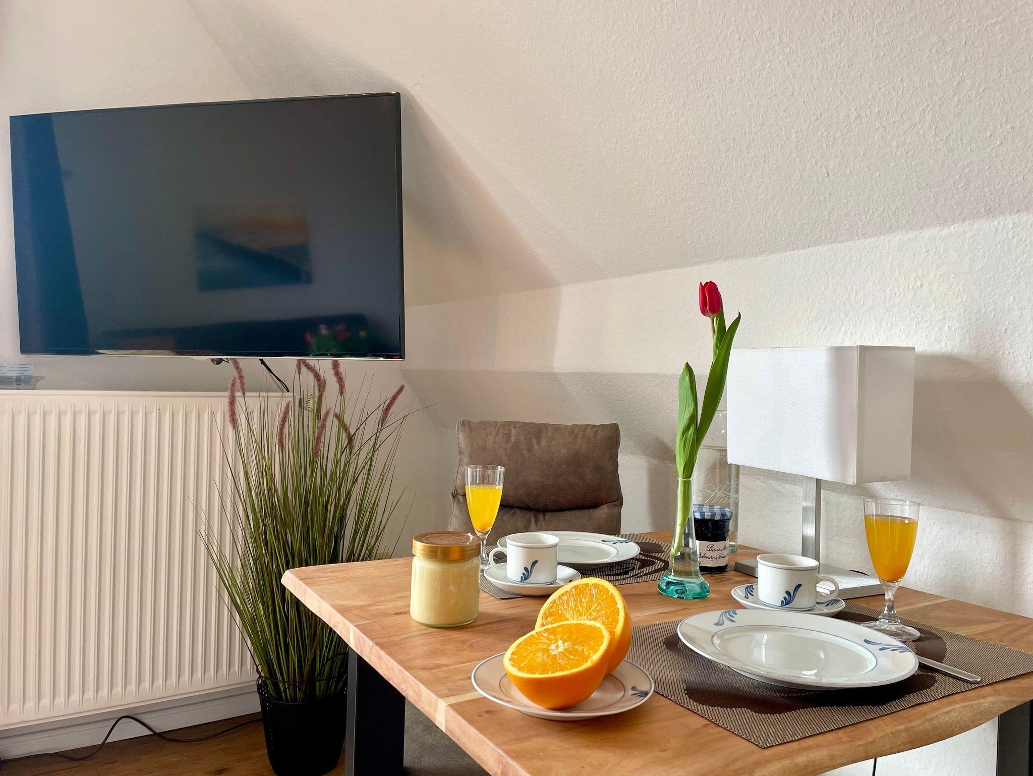 CA. 50 QM FÜR 2 PERSONEN + 1 KIND MIT BALKON Wohnraum mit Schlafcouch, 1 Sessel, Essbereich, SAT-TV, Laminatböden. Balkon nach Südwesten mit Gartenmöbel Schlafraum mit Doppelbett, 2 Nachttischen, großem Kleiderschrank, Wertfach Küchenzeile mit 2 Platteninduktionsherd, Geschirrspüler, Spüle, Kühlschrank. Weiterhin sind vorhanden Geschirr und Hausrat, Kaffeemaschine, Wasserkocher und Toaster Dusche/WC, Waschbecken, Spiegelschrank, Föhn.