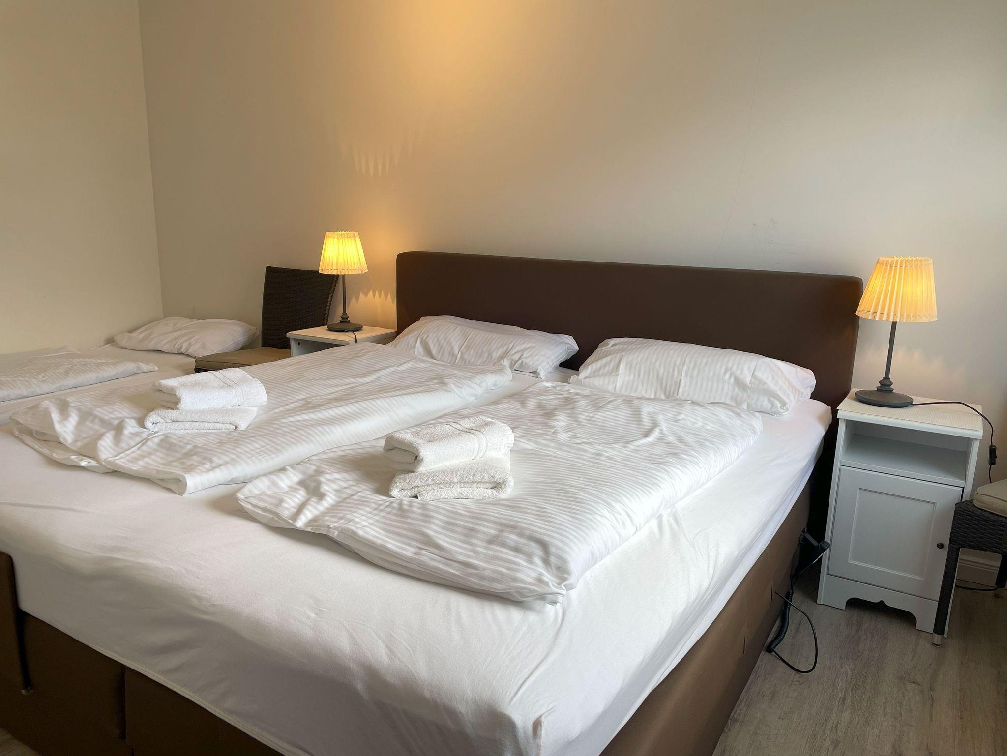 • Im Schlafzimmer befinden sich ein Doppelbett mit Nachttischen, eine Schlafcouch als Einzelbett und ein begehbarer Schrank.